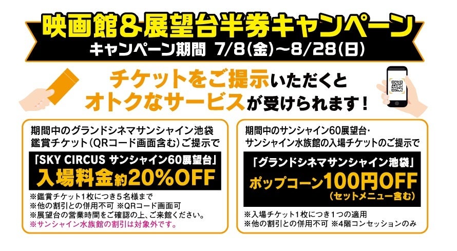 キャンペーン期間中、「グランドシネマサンシャイン 池袋」と「SKY CIRCUSサンシャイン60展望台」にて、お互いのチケットをご提示いただくとそれぞれお得なサービスを受けられます。