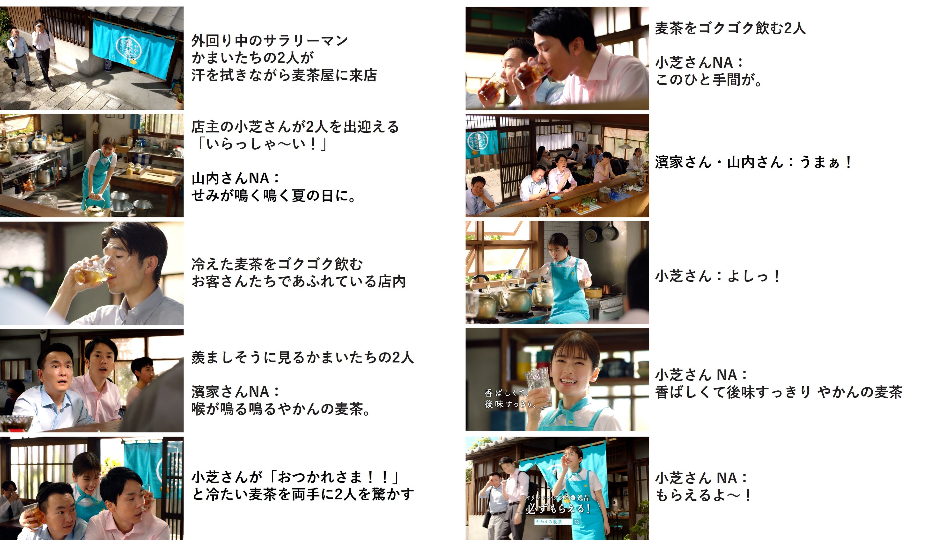 その続編となる今回のCMは、常連客のサラリーマンを演じるかまいたちのお二人が真夏の炎天下の中“やかんの麦茶屋”に来店し、小芝さんが「いらっしゃい!」という元気な声で出迎えるところからスタート。店内にはきゅ~っと冷やした麦茶をおいしそうにゴクゴク飲むお客さんで溢れています。そんな店内の様子を羨ましそうに眺めるかまいたちのお二人の背中から、「おつかれさま!」とそれぞれの頬に冷たく冷えた麦茶をくっつけ、二人を驚かせるお茶目な小芝さん。麦茶を飲んだかまいたちのお二人は「うまぁ!」と声を揃え、小芝さんもガッツポーズして満足気な表情を浮かべます。
