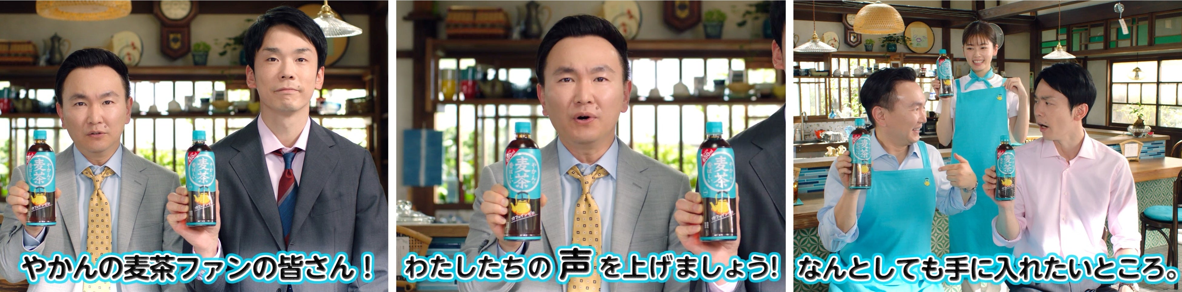 CMに登場する麦茶屋の盛況ぶりは、発売当初から大変好評をいただき、着実にファンを増やしている「やかんの麦茶」の人気を表現しています。CM出演のきっかけとなった「やかんの麦茶」ファンの山内さんや濱家さんが、素で「やかんの麦茶」をおいしそうに飲むシーンにご注目ください。