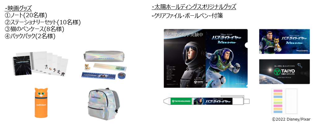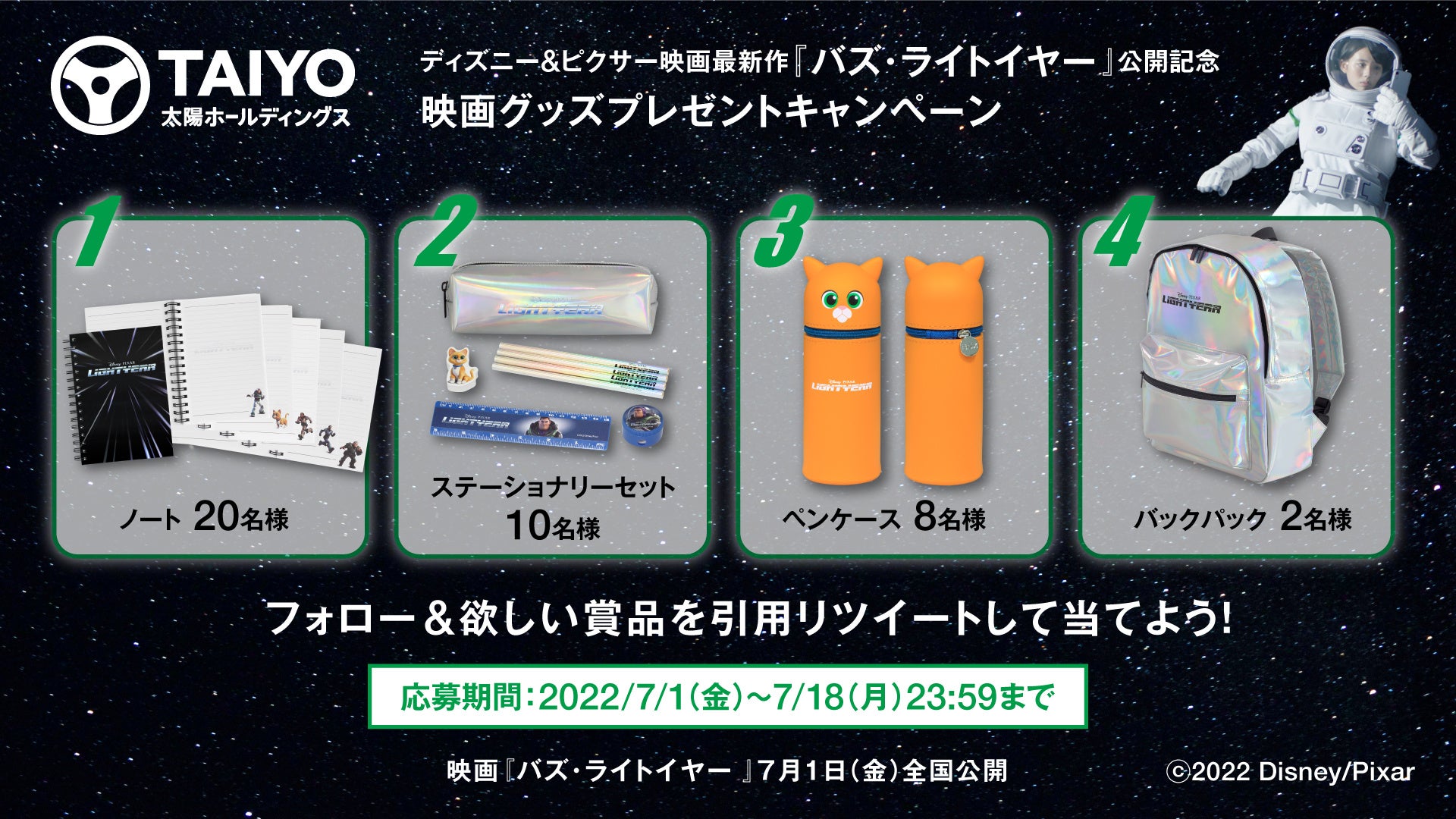 7月1日より開始するディズニー&ピクサー映画最新作『バズ・ライトイヤー』公開記念Twitterキャンペーンでは、映画グッズと太陽ホールディングスオリジナルグッズをセットで、抽選で合計40名様にプレゼントします。