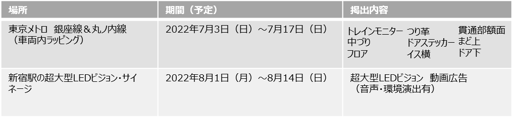 7月3日より東京メトロ銀座線・丸ノ内線の車両内をジャックした貸切電車を運行します。 また、8月1日より、新宿駅の超大型LEDビジョンに動画広告が出現します。