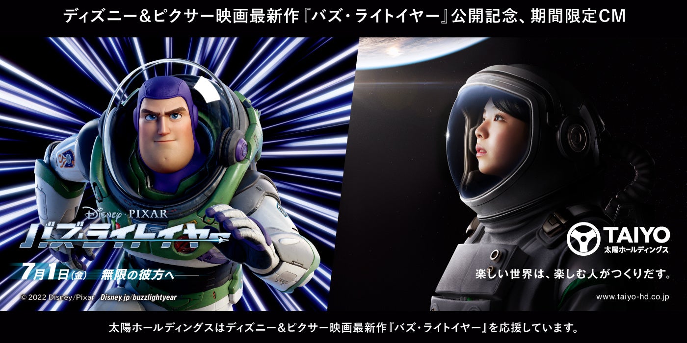太陽ホールディングスは、ディズニー&ピクサー映画最新作『バズ・ライトイヤー』の主人公である、バズ・ライトイヤーが心に秘めている「失敗を恐れず、挑戦し続ける」使命感や正義感が、企業CM「宇宙少女デビュー」篇で表現した当社の企業姿勢と重なることから、ディズニー&ピクサー映画最新作『バズ・ライトイヤー』を応援しています。