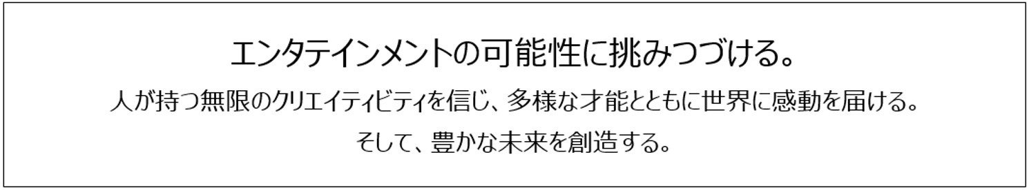 多様な才能と出会い、そのクリエイティビティを信じて、感動や共感を世界に届ける。それは、エンタテインメントの可能性に挑戦することであり、その挑戦を続けていくことで、豊かな未来を創造したい、という想いがこめられています。