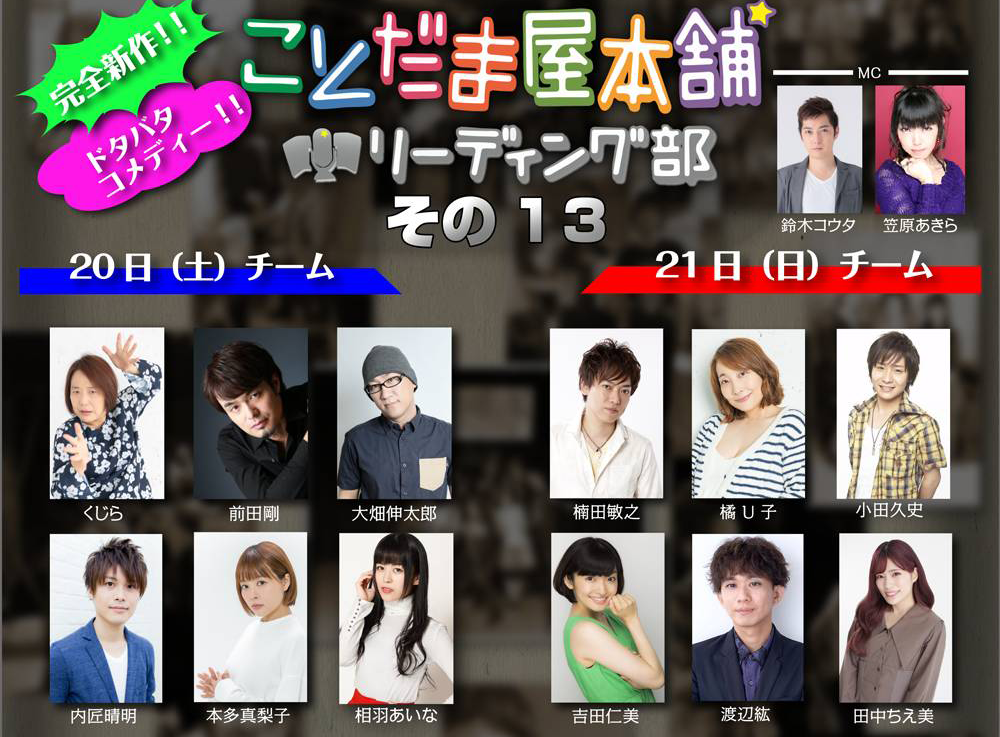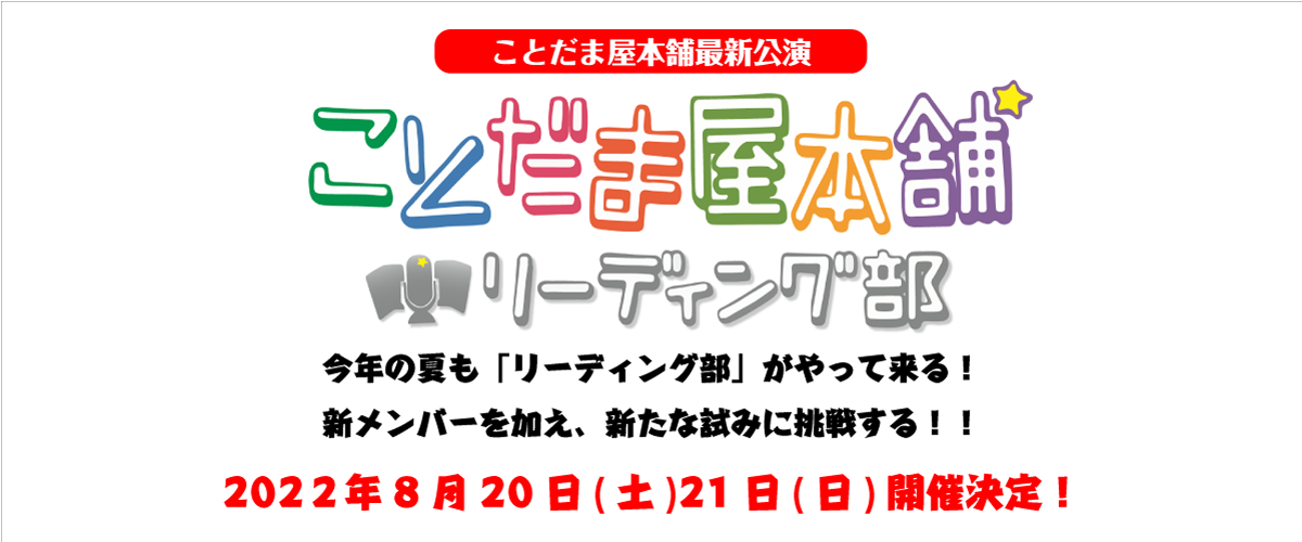 今回はコメディをベースにしたオリジナル脚本を公演内でキャストチェンジすることで毎回新しい色を出すことだま屋本舗の本公演「リーディング部」の第13弾を8月上演する。