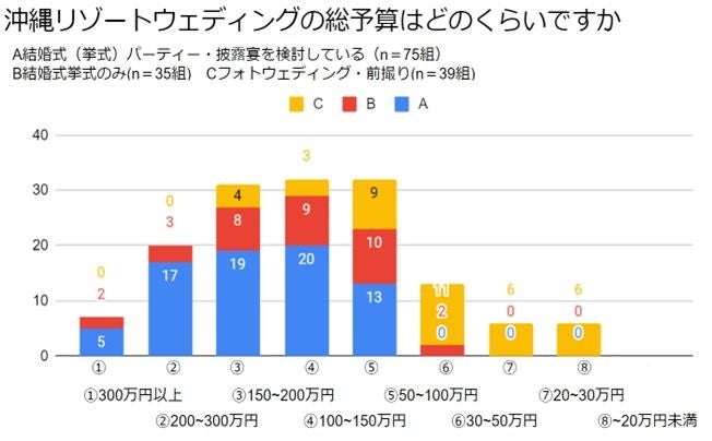 また沖縄リゾートウェディング協会は2022年に行った沖縄リゾートウェディングフェアin東京2022で沖縄リゾートウェディングを望むカップル(149組)へのアンケートで「沖縄リゾートウェディングの平均滞在日数」「沖縄リゾートウェディングの総予算」を以下の通り調査している。