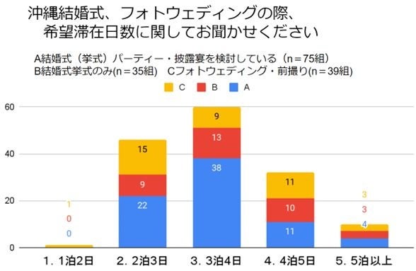 コロナ禍を期に、沖縄リゾートウェディングを希望するカップルの希望滞在日数と総予算が3泊4日と100万-150万円が最も多く、4泊以上が全体の28%、フォトウェディングで100万以上が41%になった。
