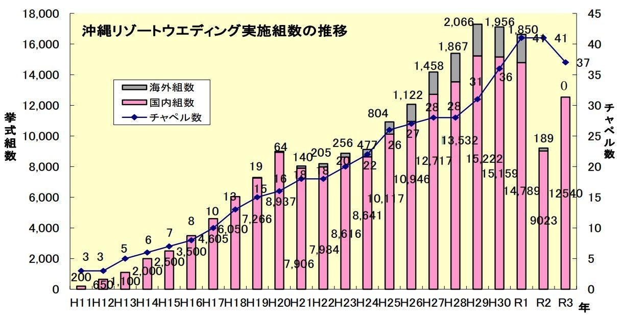 ※「沖縄リゾートウエディング」とは、県外及び海外に在住する新郎新婦が、沖縄でウエディングを挙げることを目的に来県し行うウエディングのこと。チャペルウエディングだけではなく、フォトウエディングやビーチ・レストラン・琉装ウエディングなども上記沖縄県観光振興課の調査対象に含めている。