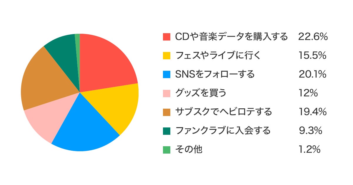 好きなアーティストの応援方法として、一番多かったのは「CDや音源データを購入する」でしたが、「サブスクでヘビロテする」という回答も20%近くを占めており、音楽サブスクでアーティストの楽曲を聴くことが応援につながっている認識は浸透していました。その背景には、大手ランキングサイトなどが、サブスクの視聴データを反映しはじめたことにより、サブスクで楽曲を聴くこともランキングに寄与できると、ユーザーへの認知が広がったからだと考えています。