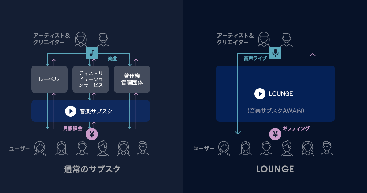 また、機械的にレコメンドされた楽曲や他人からのなおすすめ曲などに、あまり興味のないユーザーに対しては、カラオケやミュージックバーのように同じ空間で楽曲を聴くことで、自然に新しい音楽と出会うことができるLOUNGEが、新しい音楽との出会いに役立つと考えています。今回、7周年を機にこれまでアーティストや一部のユーザーのみ利用可能だった、LOUNGE(ラウンジ)の「音声ライブ配信」「ギフティング)による収益化」機能を全ユーザーに解放しており、さらに多くのユーザーに楽しんでもらえるものとなりました。