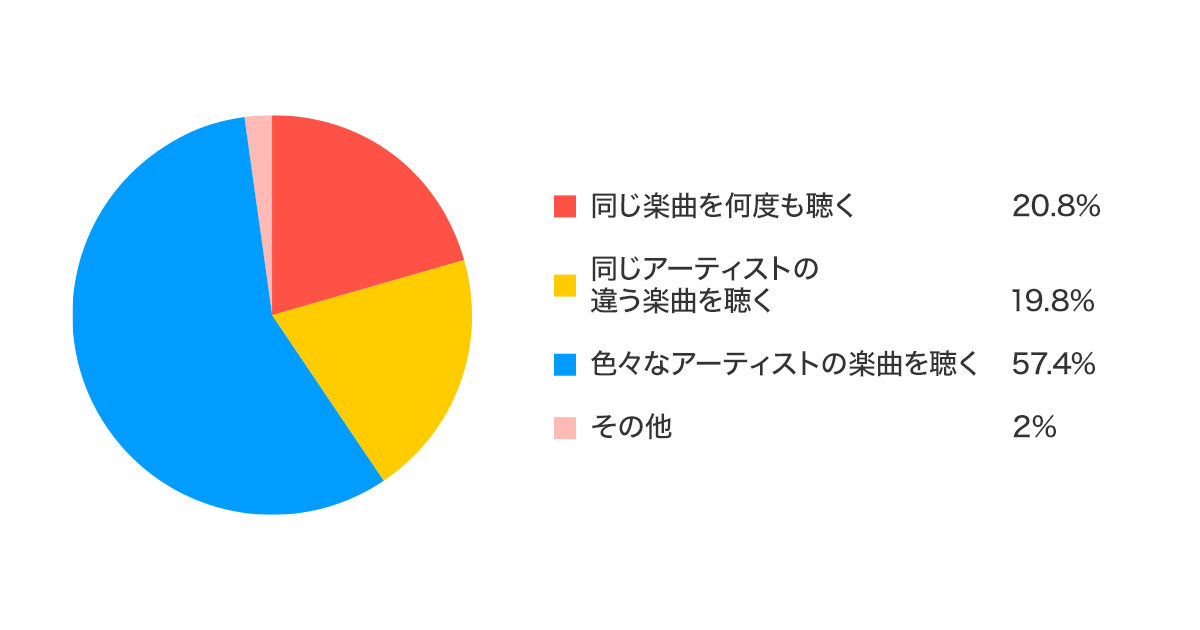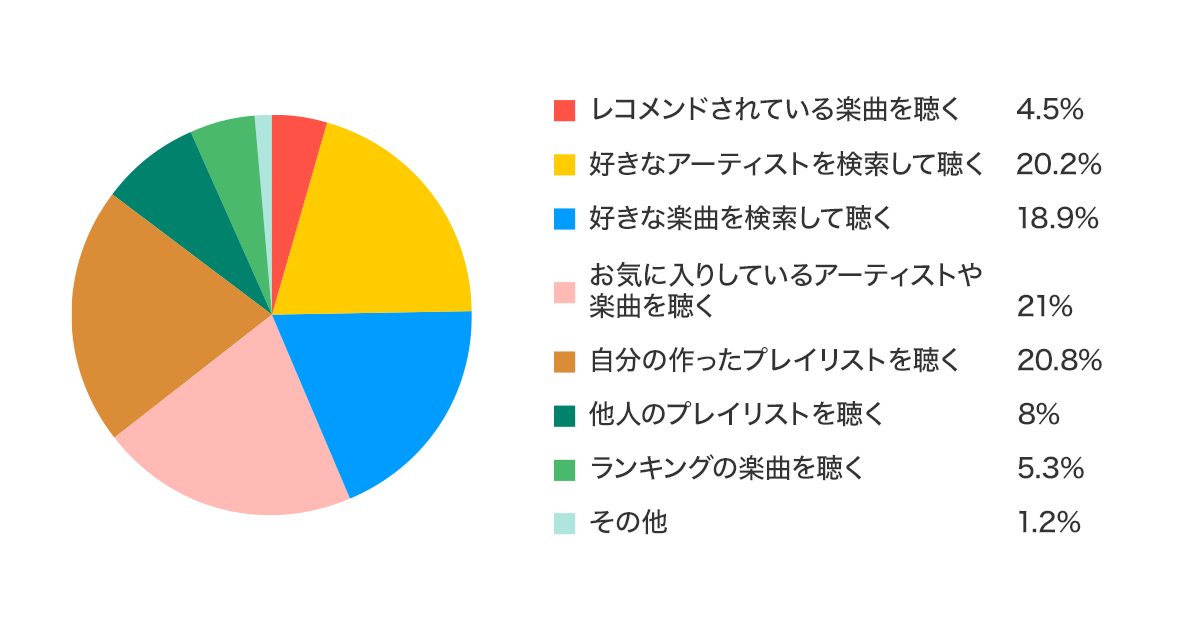 視聴スタイルの質問では、単一のアーティストや楽曲を聴く人も多くいましたが、色々な楽曲を聴くと回答した人も6割近くおり、多くの楽曲に触れあいたいと思っているユーザーも多いことが分かりました。しかしながら、続く再生方法に関しての質問では、「レコメンドされている楽曲を聴く」や、「他人のプレイリストを聴く」など、機械や人から勧められた楽曲を一方的に聴くと答えた人は全体の13%ほどしかおらず、既存の音楽との出会い方だけでなく、他の方法や機会求めているユーザーも存在する傾向が伺えました。