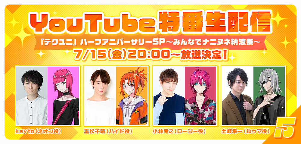 新機能実装を記念し、7月15日(金)20時より『テクノロイド』公式YouTubeにて特番生配信を開催いたします。kayto(ネオン役)、重松千晴(ハイド役)、小林竜之(ロージー役)、土岐隼一(ルゥマ役)が登場し、新機能「ソロライブ」で実際にプレイする様子をお届けいたします。さらに「ユニゾンフェス」本選出場グループも発表いたします。