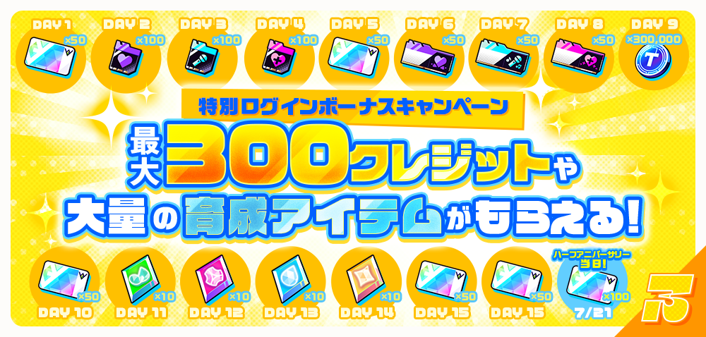 7月4日(月)12時より、ハーフアニバーサリーを迎える7月21日(木)までの間、特別ログインボーナスキャンペーンを開催いたします。開催期間中、ログインすると毎日様々な育成アイテムを獲得できる他、ハーフアニバーサリー当日のログインボーナスと合わせると最大300クレジットを獲得することができます。