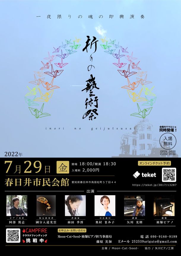 「個性、特技で生きていく」をコンセプトに自分達が見たい平和な世界を築くため、さまざまなマルシェ、ワークショップ、地域のイベントに参加、企画、運営等している、Moon・Cat・Seed・(所在地:愛知県春日井市、代表:杉本 達哉)は、「和太鼓」×「被爆ピアノ」×「書道」の一夜限りの即興演奏のイベント「祈りの藝術祭」を2022年7月29日(金)に愛知県春日井市鳥居松町5-44の春日井市民会館で行います。