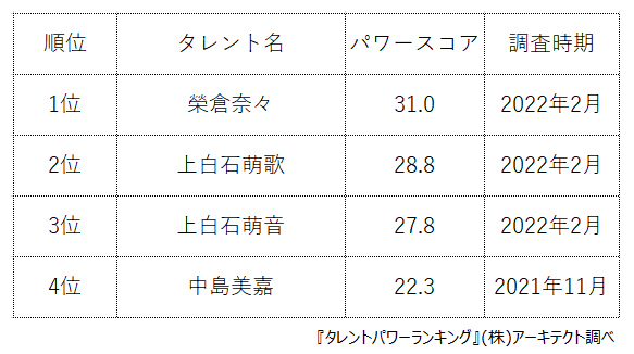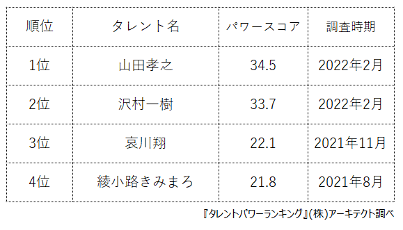 本ランキングは、2022年2月度に実施したタレント調査データ(一部過去実施データ)を利用し、タイトルに応じてランキング形式でまとめたものです。