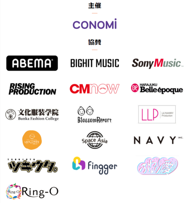 (株)AbemaTV/BIGHIT MUSIC/(株)ソニー・ミュージックエンタテインメント SDグループ/(株)ライジングプロダクション/(株)NAVY/CMNOW/文化服装学院/(株)ブロッサムレポート/スペースエイジア/リリマリプロダクション/地球の子供食堂/ベルエポック美容専門学校/ツキウタ。/fingger/ふわり愛/(株)Ring-O