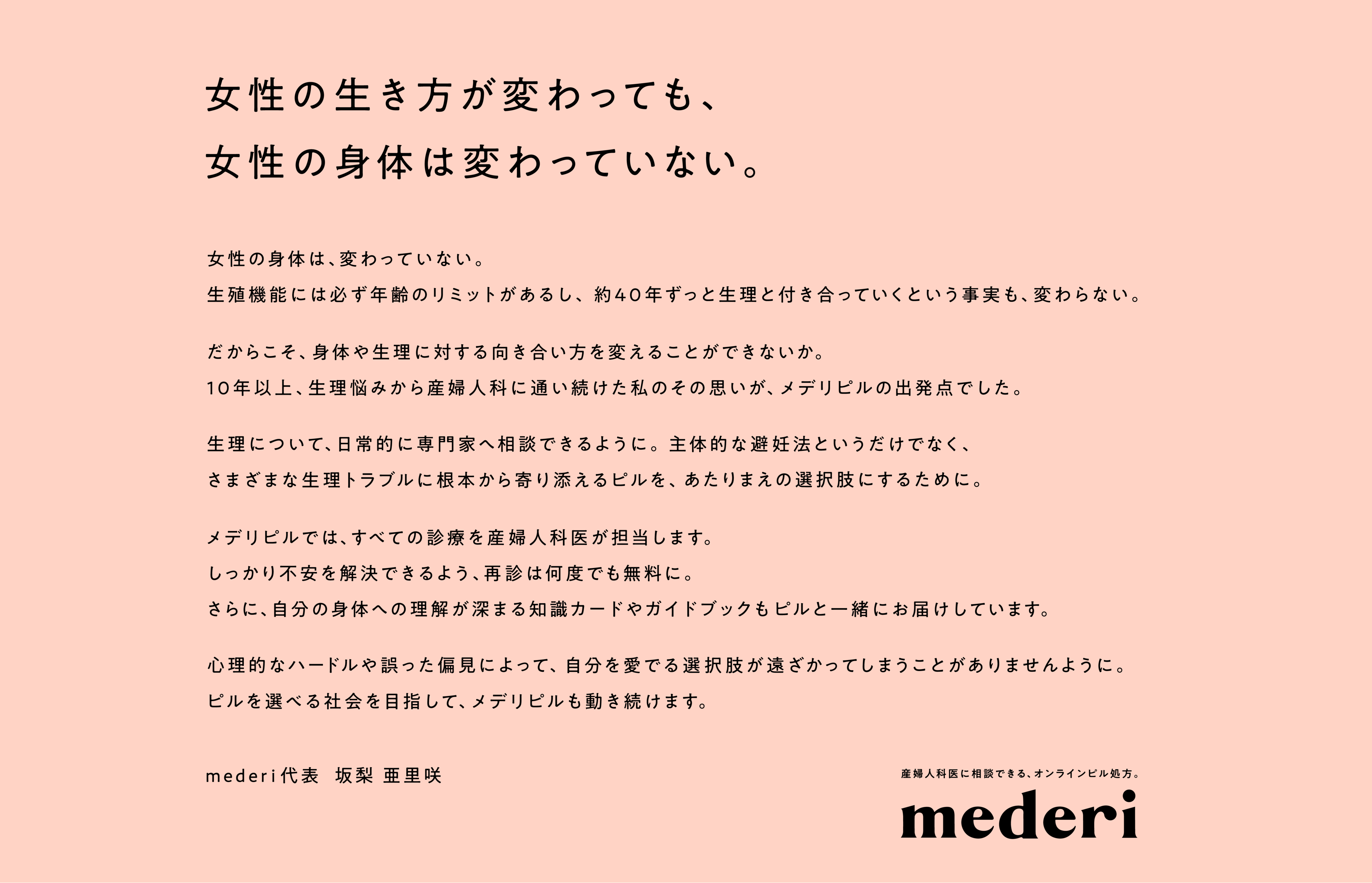 私自身、生理不順改善のために10代から妊娠希望するまで10年間ほどピルを飲んでいた経験があり、20〜30代の働く忙しい女性でも簡便に、毎月訪れる生理トラブルやPMSへのケアができるよう、この度『mederi Pill(メデリピル)』をスタートしました。