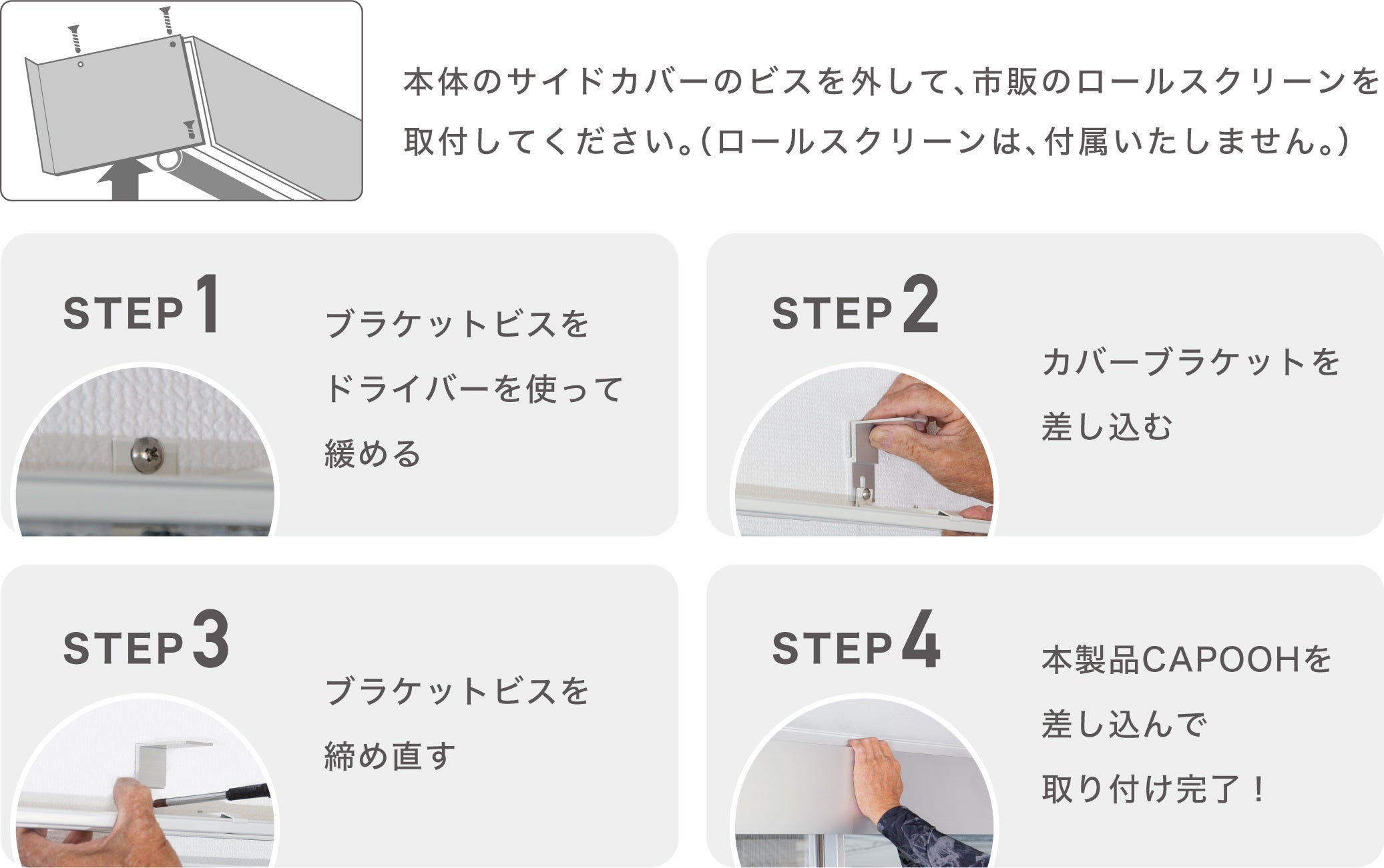 ※ロールスクリーンを取付の際は、CAPOOH本体の小口フタを取り外し、横からレールに差し込んで取付してください。