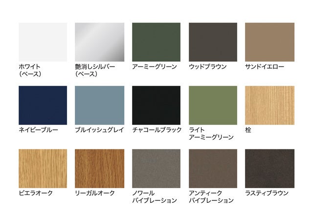 ホワイト、艶消しシルバーのベース2色のほか、アーミーカラー7色、木目/メタル調6色の全15色からお部屋に合わせたカラーをセレクト。