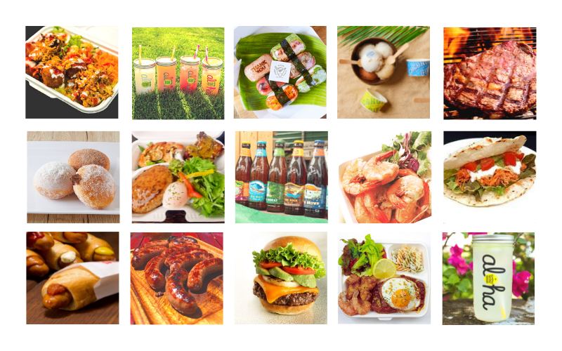 会場中央には、人気のハワイアンメニューを取り揃えたキッチンカーが勢ぞろい。ハワイのローカルフードからシェイブアイス、マラサダ、レモネードのほか、もちろんハワイのビールも各種取り揃えています。オシャレな瓶のハワイビールを片手にショッピングやショーを楽しんで!!