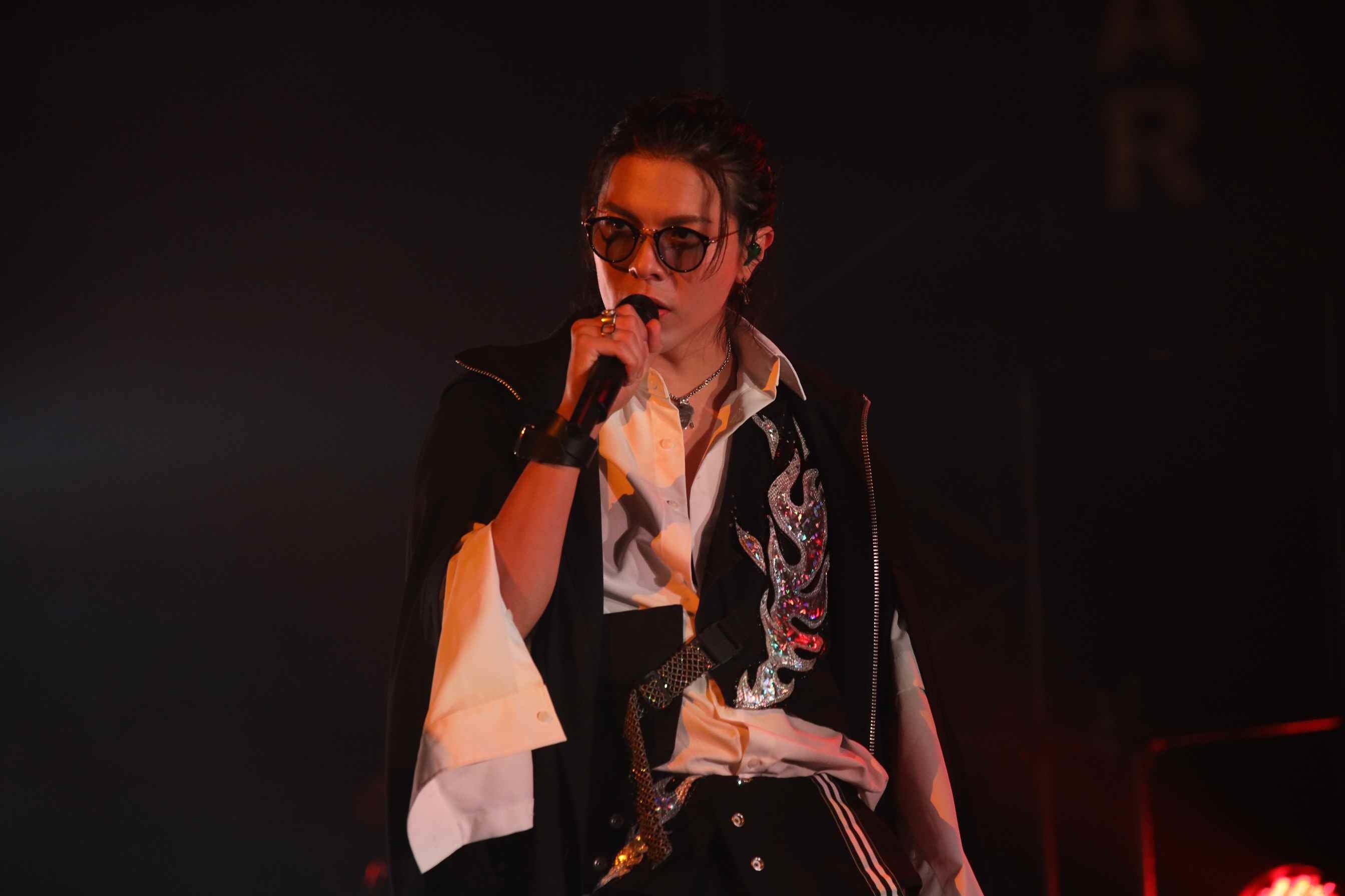 入れ替わるようにスタンガンとあじっこもステージへ。軽やかな楽曲を笑顔いっぱいで歌う。チームPのステージでは他のチームであまり笑顔を見せないダンサーも笑顔で踊り、チームPのカラーを全身で表現する。そしてライブはあじっこの歌う「陽はここに」へ。こぼれるような笑顔であじっこ自身もダンサーと共に踊りながら歌っていると、尺八の音が……!現れたのはTORA、たぬき、SHIMa、TAKAHIRO。その後ろからIDEが悠然と登場。あの日のスターレスの再現の如く「日蝕」が響く。『BLACK LIVE』を踏襲した演出を経て、ステージはそのままチームBのターンへ。“不死鳥”のように蘇り続けるチームBを称える「讃B歌」で5人の勢いをオーディエンスへと刻み付けると、こちらも『BLACK HALLOWEEN』で披露されたチームBライブの真骨頂曲、「炎神」と「雷神」をIDE自らマッシュアップしたという「炎雷神」でフロアを席捲し、続けて小林が登場。昨年のツアーで生まれた小林とIDEのコラボバージョンでの「Bad Blood」を響かせて、ブラックスターのライブならではの熱で会場を満たした。