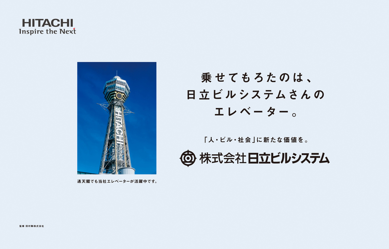 株式会社日立ビルシステムは、このたび、大阪のシンボルとして親しまれている「通天閣」と「ビリケンさん」とのコラボレーション広告を関西国際空港第2ターミナルビルに掲出しました。本広告は、幸運の神様として「通天閣」を支えてきた守り神「ビリケンさん」がエレベーターの中から搭乗前のお客さまをお見送りするデザインになっています。関西国際空港をご利用の際は、ぜひご覧ください。