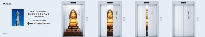 株式会社日立ビルシステムは、このたび、大阪のシンボルとして親しまれている「通天閣」と「ビリケンさん」とのコラボレーション広告を関西国際空港第2ターミナルビルに掲出しました。本広告は、幸運の神様として「通天閣」を支えてきた守り神「ビリケンさん」がエレベーターの中から搭乗前のお客さまをお見送りするデザインになっています。関西国際空港をご利用の際は、ぜひご覧ください。