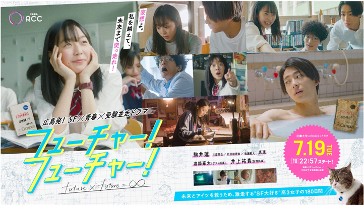 ㈱中国放送は、近畿大学工学部の全面協力で大学受験並走ドラマ『フューチャー!フューチャー!』を制作し、7月19日(火)から放送します。企画・脚本を手がけたのはクリエイティブ集団「PARTY」の眞鍋海里、監督には、自身が広島出身で、Huluドラマ『モモウメ』や多くのTVCMを手がける山本ヨシヒコを起用。主演は、映画やドラマで活躍中の女優・駒井蓮、未来からきた謎の青年シンイチ役を注目の広島出身の俳優・井上祐貴が務めます。