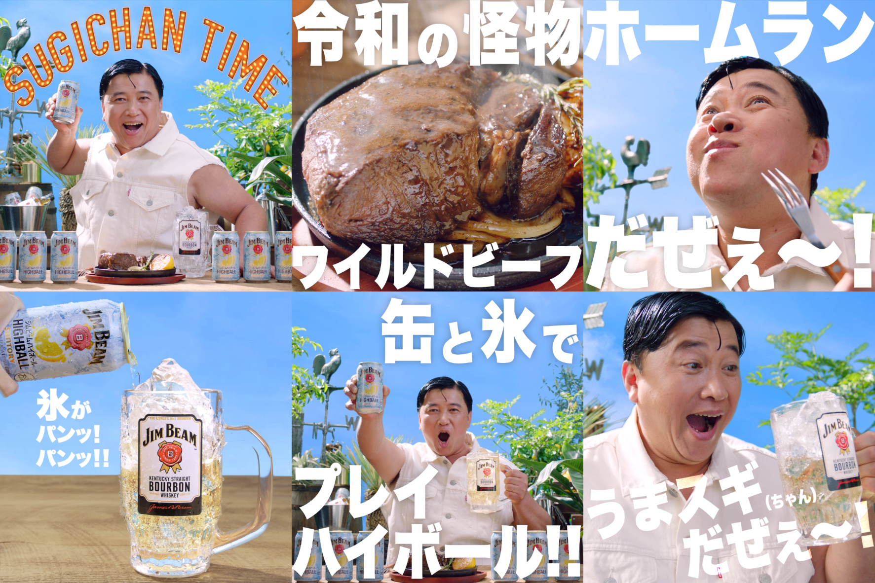 「今日はジムビームとの一戦を実況するぜぇ〜!」と、野球の試合の実況さながらに青空の下で熱く語るスギちゃん。塊肉のワイルドビーフに挑んだ後、氷をパンッパンに詰めたジョッキに注がれた「ジムビーム ハイボール缶」を「プレイハイボール!」と宣言したのち、「うまスギだぜぇ~!」とワイルドに楽しむ様子が描かれています。