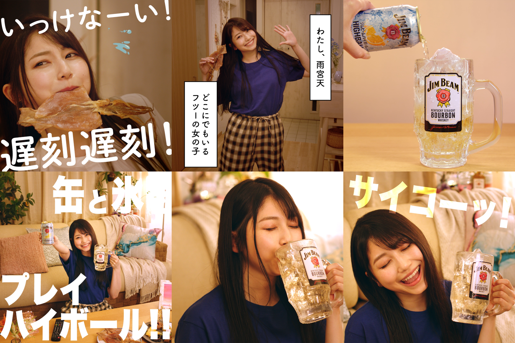 YouTube動画風にいつもの挨拶で登場。アメリカ生まれのジムビームに合わせて、ジャンキーなチーズフライドポテトを堪能した後は、「アメリカ帰りの酒彼氏」と称する「ジムビーム ハイボール缶」を、コンビニで販売されているお手軽なカップ氷に注いでいく。そして「プレイハイボール!」と宣言し、飲んで食べてを繰り返しながら「おいしー――!」と悶絶する様子が描かれています。