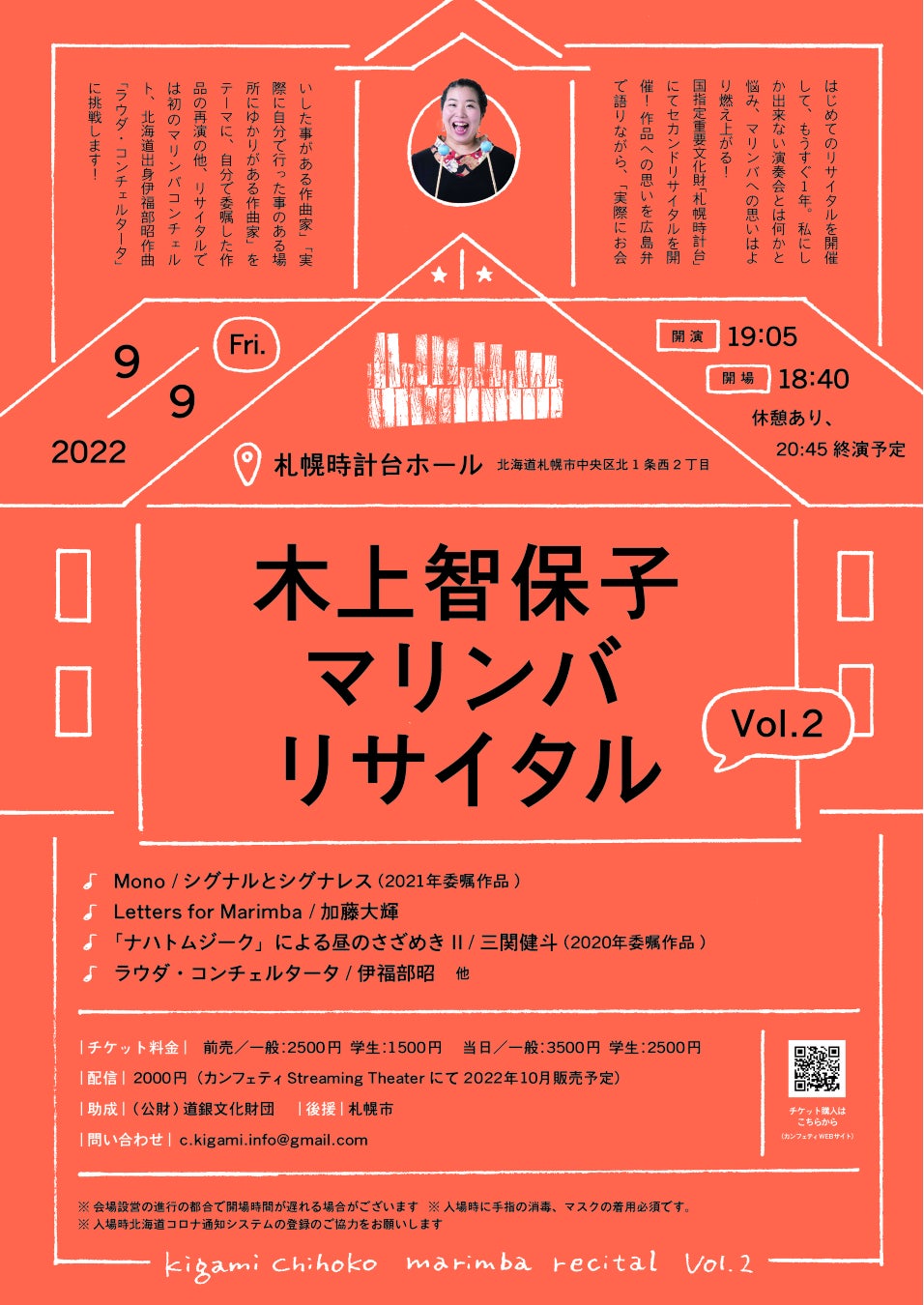 Chihoko&『木上智保子マリンバリサイタルvol.2』が2022年9月9日(金) に札幌時計台ホール(北海道札幌市中央区北1条西2丁目)にて開催されます。