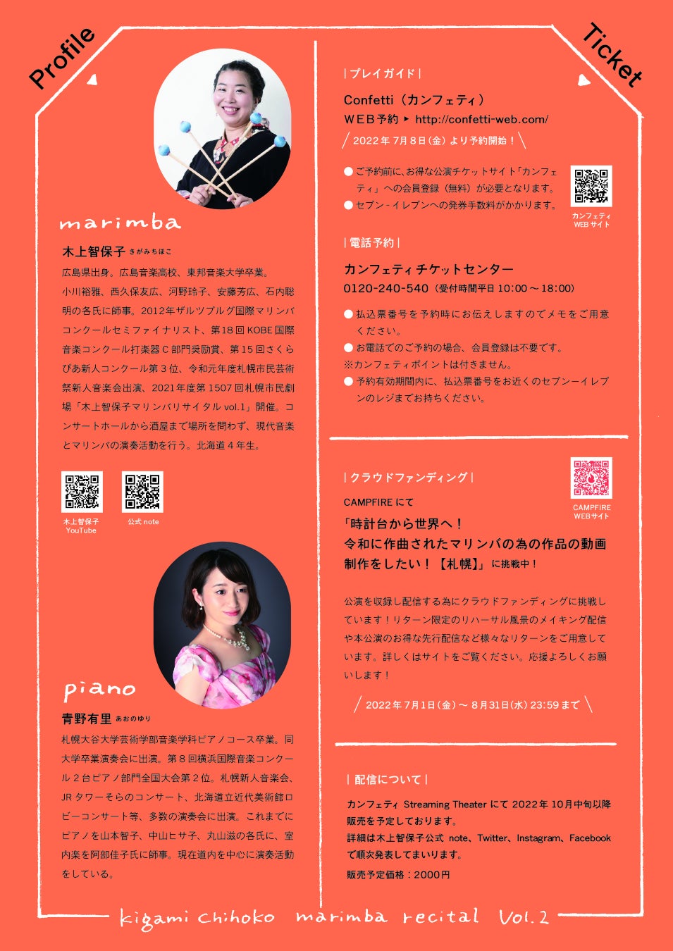 昨年10月に開催した木上智保子マリンバリサイタルvol.1からもうすぐ1年。ただリサイタルをもう一度開催するのではなく、「木上智保子だから出来る演奏会とは?」と悩み、楽器と向き合い、「実際にお会いした事がある作曲家」「実際に自分で行った事のある場所にゆかりがある作曲家」をテーマに選曲しました。自身が委嘱した作品の再演、2010年以降に作曲された作品、北海道/音更の伊福部昭記念館まで足を運んだ思い出深く(https://note.com/chihoko_and/n/na397cb2bcfc2)マリンバ奏者が憧れる名曲「ラウダ・コンチェルタータ」に挑戦します。
