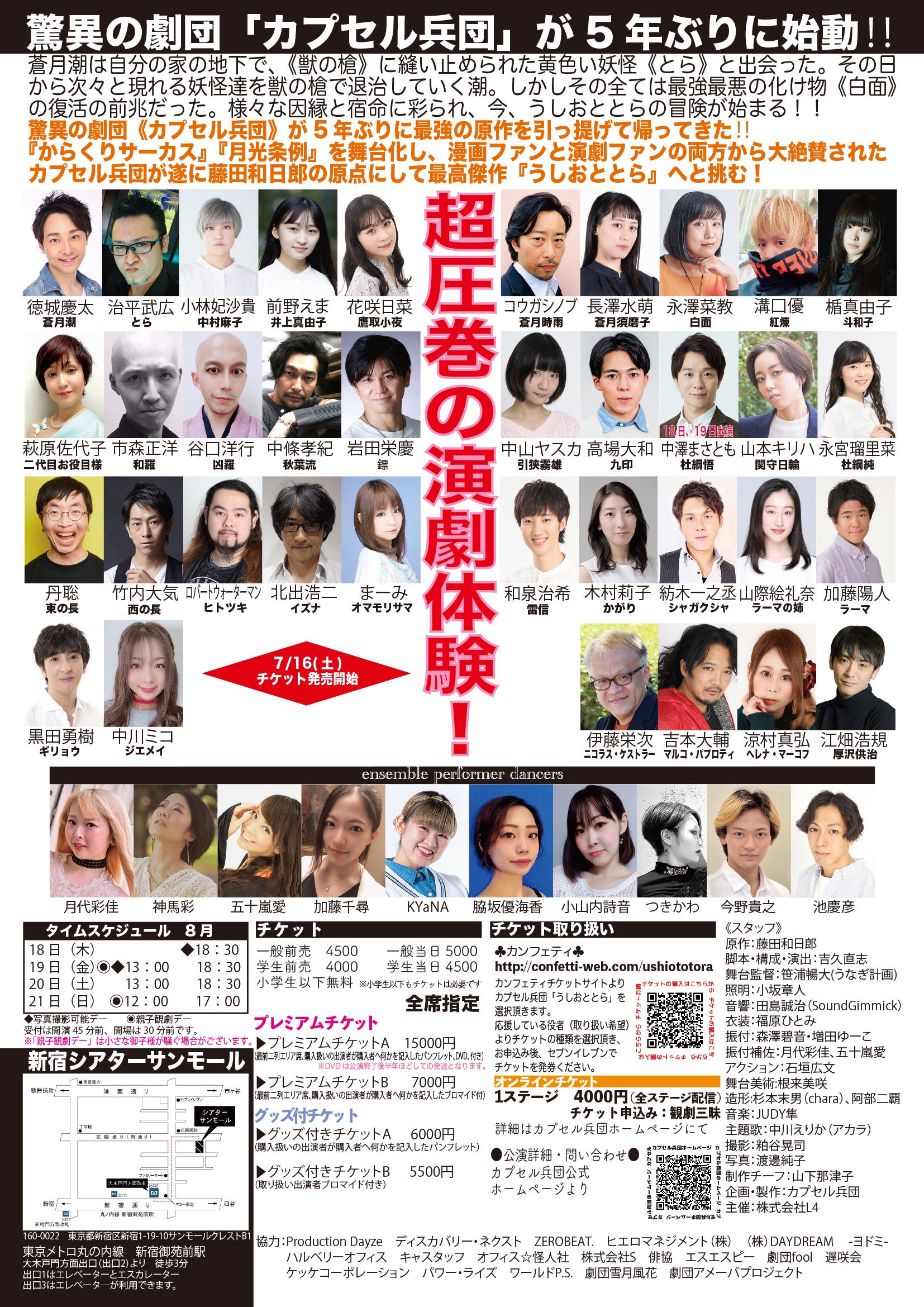 株式会社L4プロデュース カプセル兵団《アナザーメディアオペレーション》舞台『うしおととら』が2022年8月18日(木) ~ 8月21日(日)にシアターサンモール(東京都新宿区)にて上演されます。チケットはカンフェティ(運営:ロングランプランニング株式会社、東京都新宿区、代表取締役:榑松 ⼤剛)にて7月16日(土)より発売開始です。
