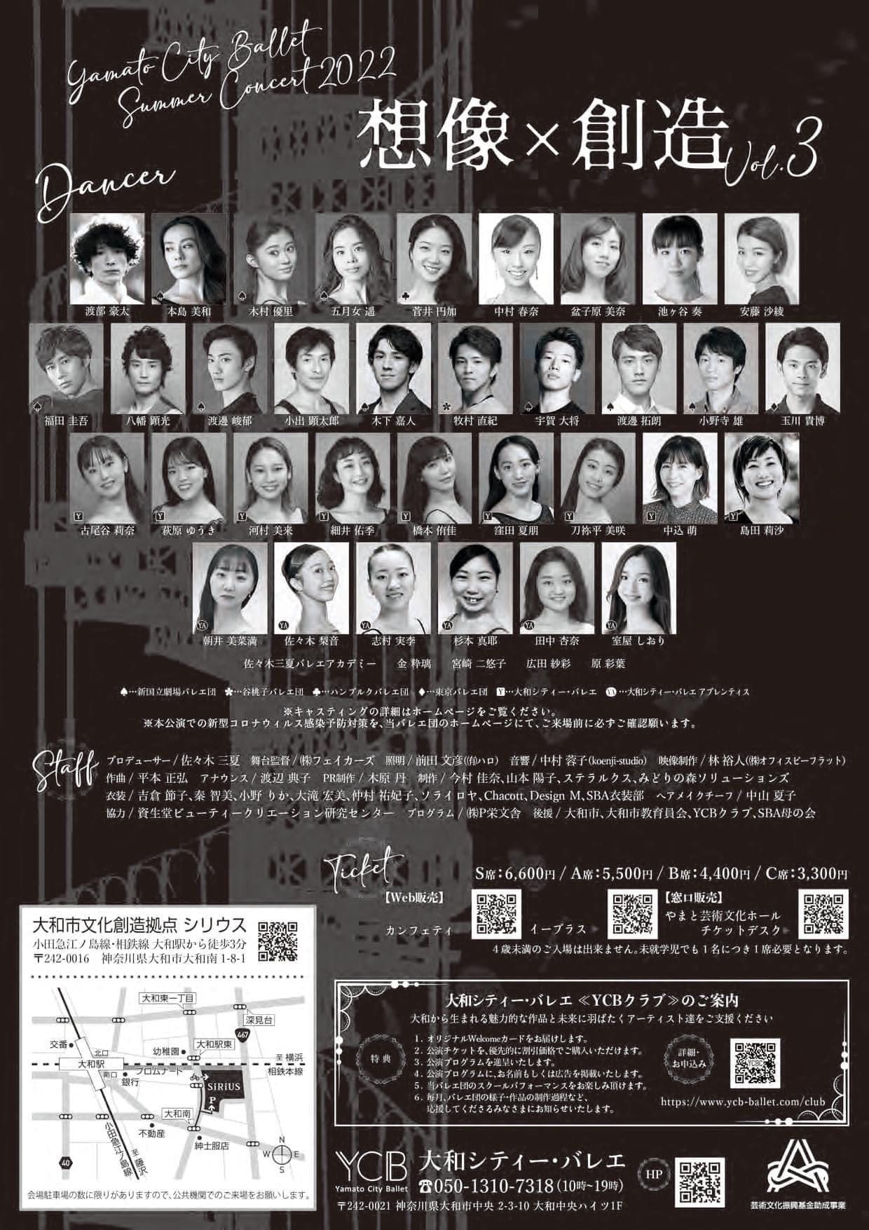 総合プロデューサーは、佐々⽊三夏。佐々⽊三夏バレエアカデミー(SBA)からは、ハンブルグバレエ団の菅井円加、モーリス・ベジャール・バレエ団の大貫真幹を始め、海外で活躍中のダンサーを沢山輩出しています。⼤和シティー・バレエ(YCB)が設⽴されたのは、「⼤和市⽂化創造拠点シリウス」が開設された2016 年秋。2019年から本格的に始動を開始しました。