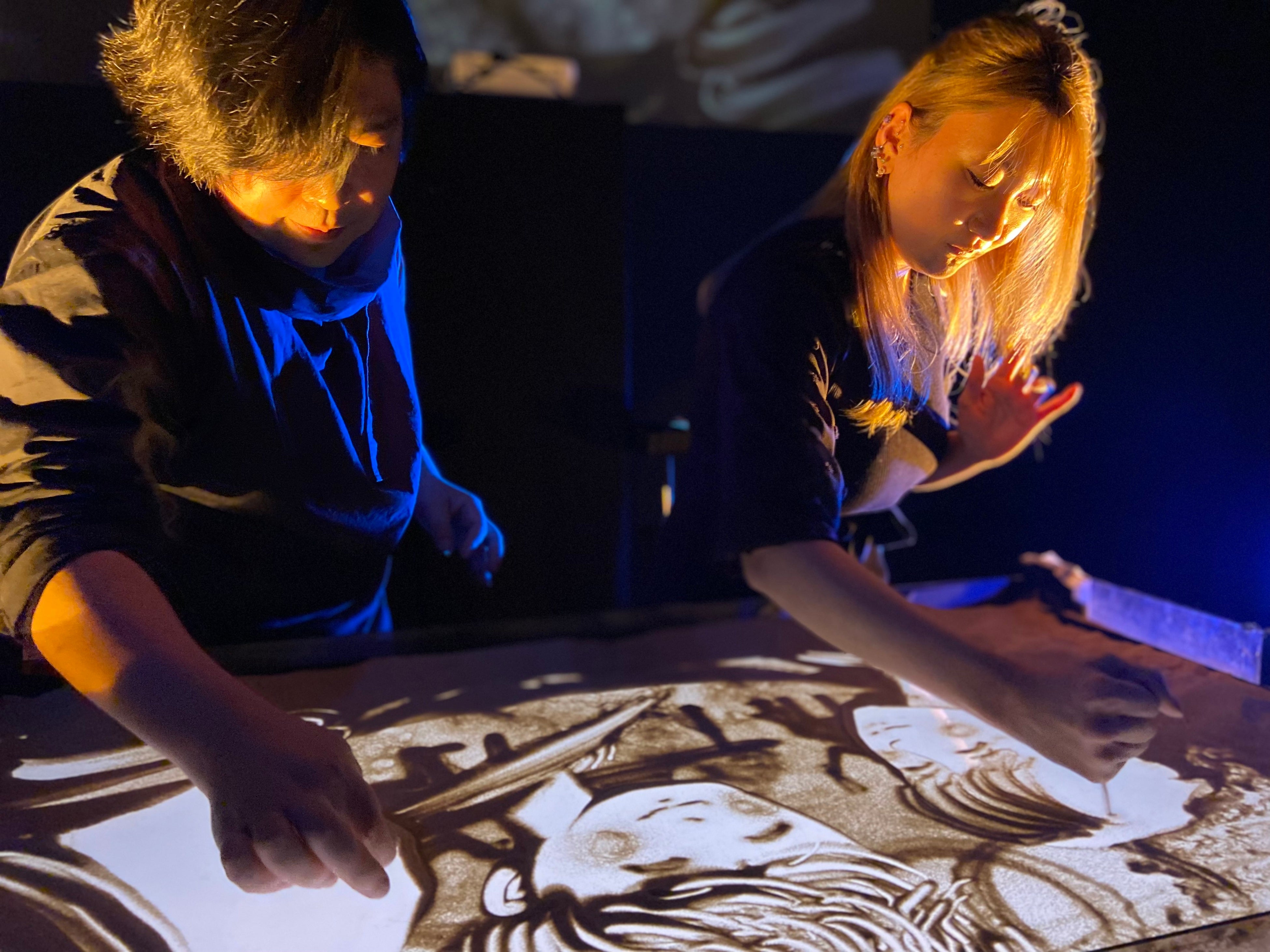 筆などは使わず、手だけで描かれる砂の絵。砂絵が様々に変化しながら