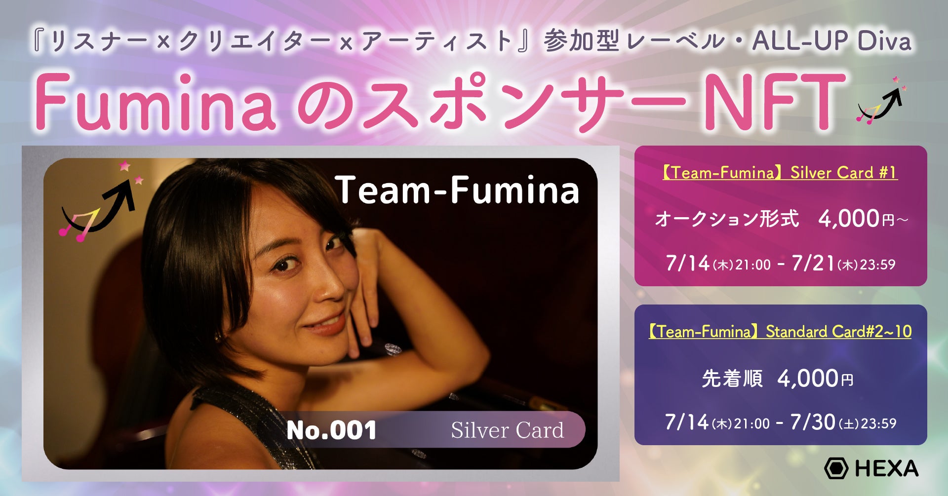 NFTマーケットのHEXA(ヘキサ)では、ALL-UP Divaのアーティスト「Fumina」のファンカードのスポンサーNFTを7/14(木)21時から販売します。