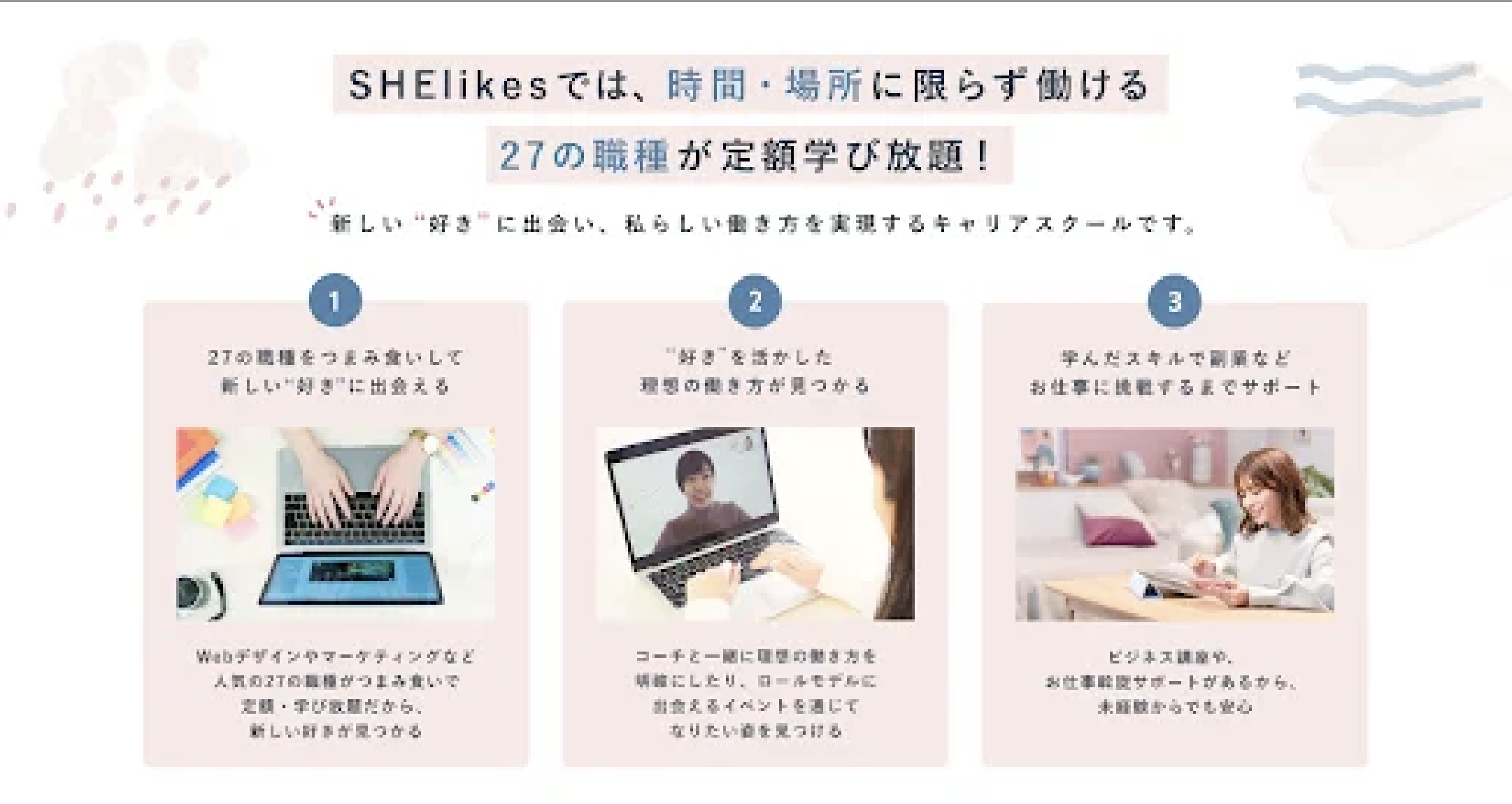 SHElikesは、Webデザイン・Webマーケティング・ライティングなどPC一つで働ける27種のクリエイティブスキルを幅広く学び、今の時代に求められるマルチクリエイターを育成して、時間や場所に縛られない賢く私らしい働き方を実現するためのキャリアスクールコミュニティです。