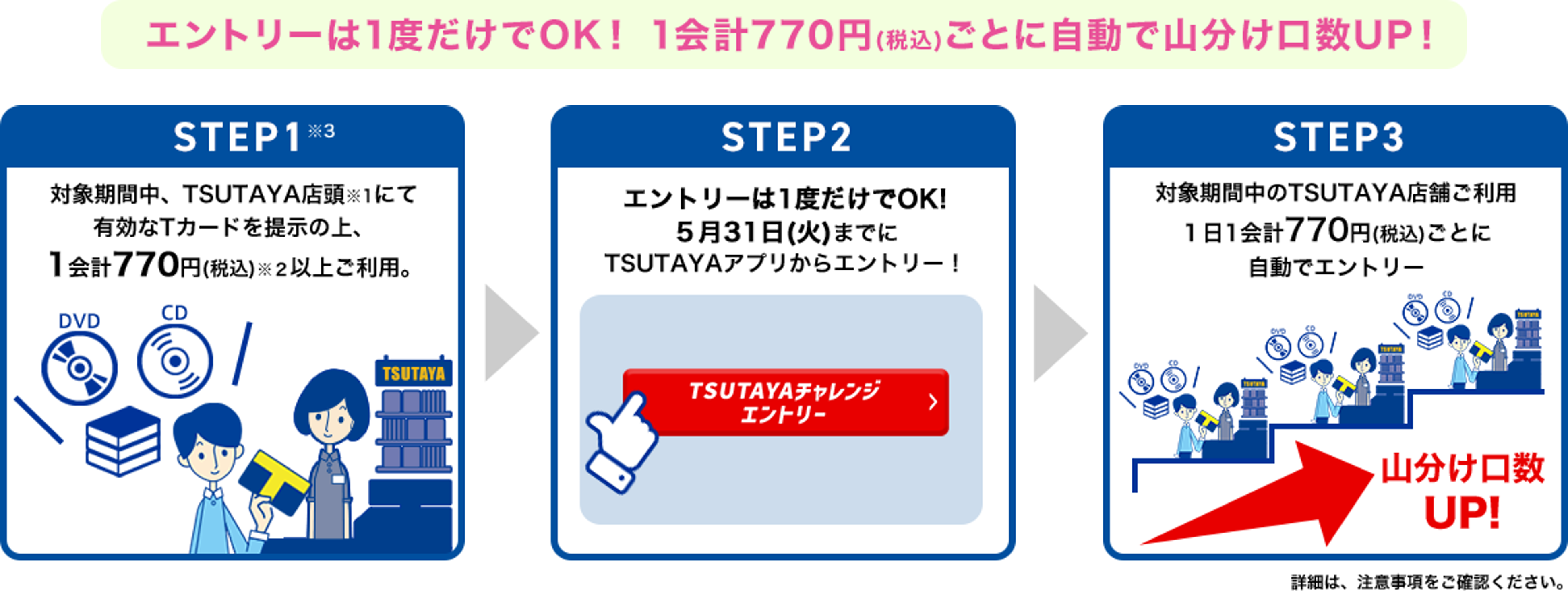 ※一度TSUTAYAアプリからエントリーいただくと、770円(税込)以上のご利用を一口に、自動でエントリーされ、山分け口数が増えていきます。