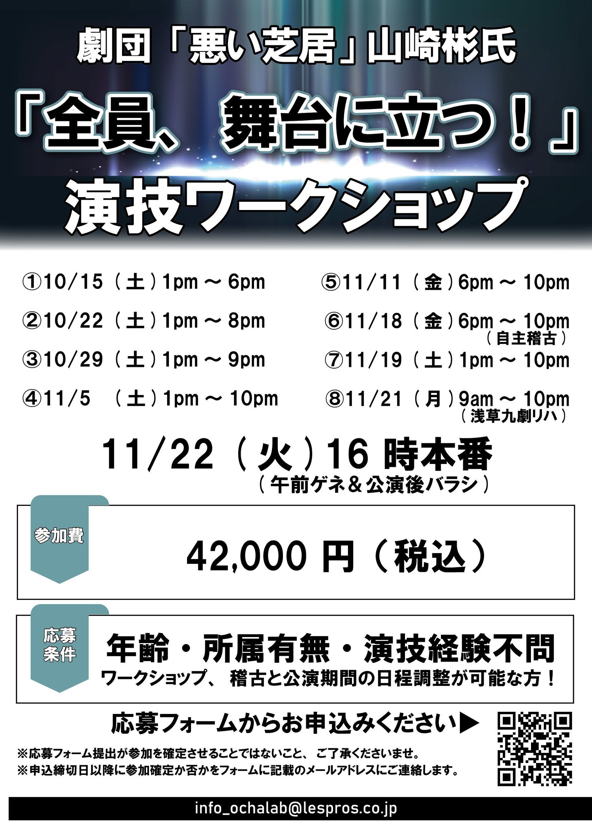 本ワークショップは、演技を学びながら、作品を作り上げ、また人前で演じるまでの過程を盛り込んだ内容となっており、前半のシーンスタディを通して参加者の個性を観察した上で、山崎氏自らが、参加者に合わせて作品を書下ろしてくださいます。その作品は、都内劇場「浅草九劇」にて、全員で上演することを予定しています。