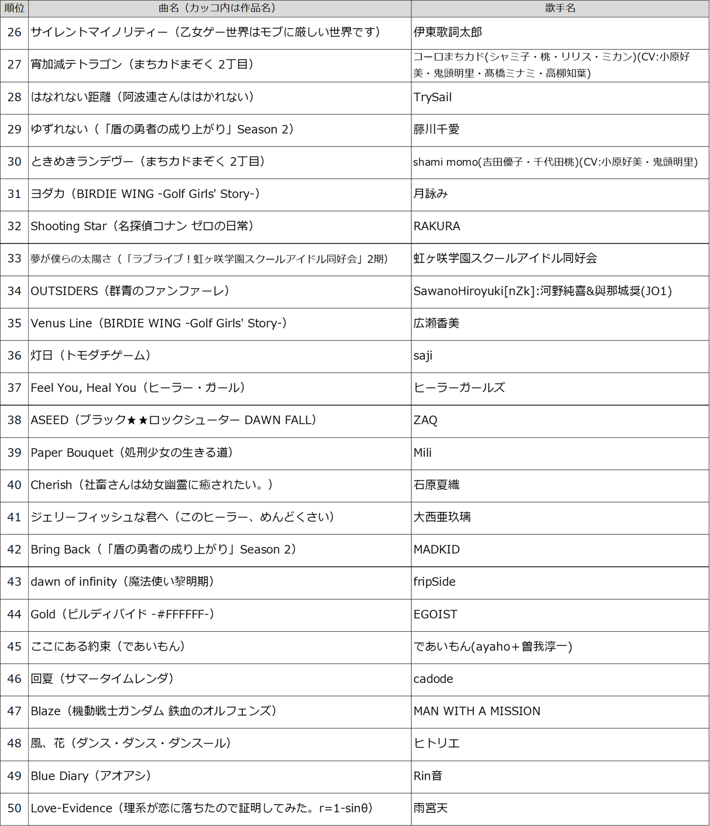 ※ 放送が期をまたぐ作品で楽曲が前期と同じ場合は対象外となります。