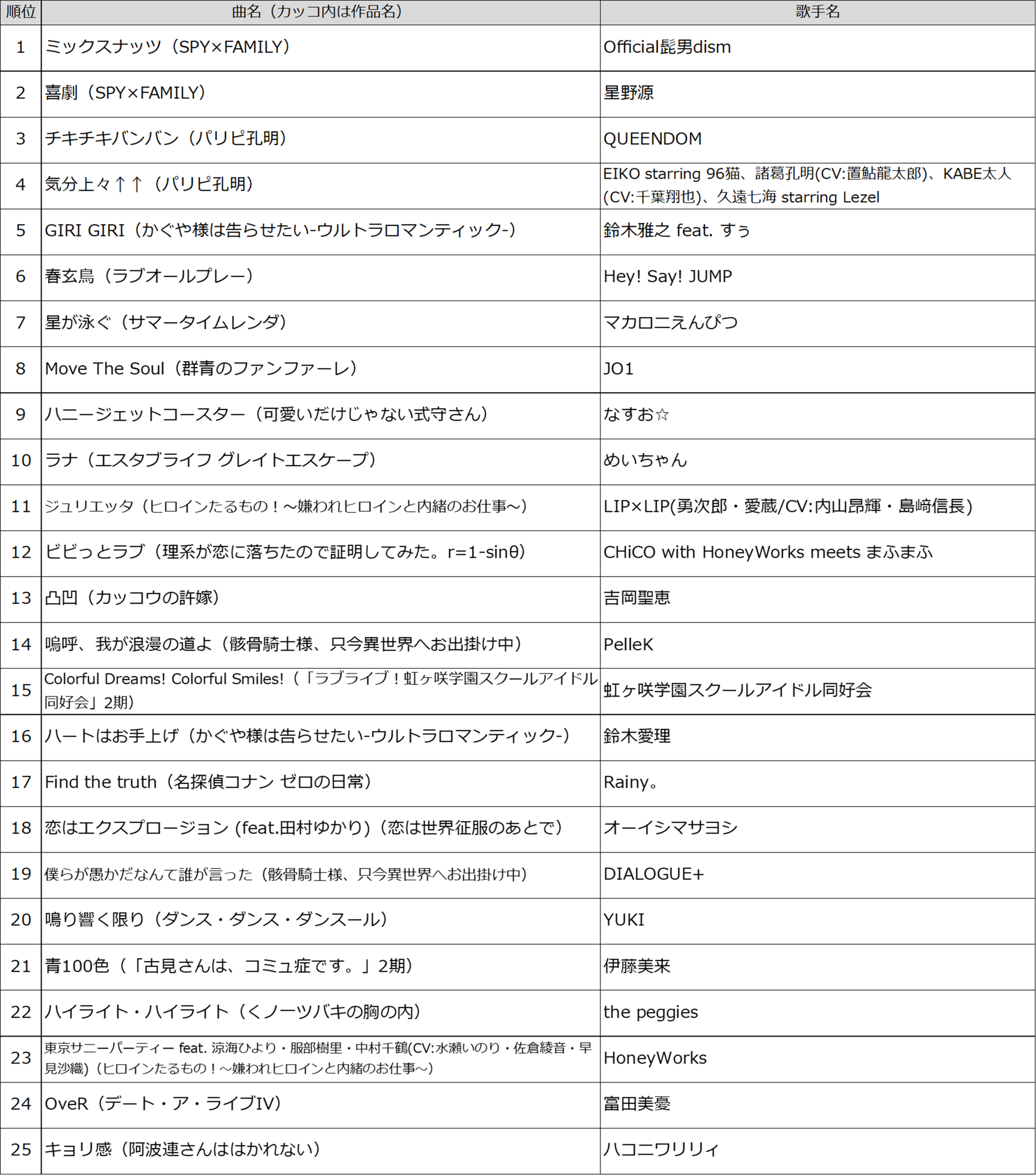 圧巻の強さを見せたのは、1位に輝いた『SPY×FAMILY』のオープニングテーマ(以下、OPテーマ)「ミックスナッツ/Official髭男dism」、2位を獲得した同エンディングテーマ(以下、EDテーマ)「喜劇/星野源」です。アニメ化発表前から大きな注目を浴びていた『SPY x FAMILY』は、原作コミックの累計発行部数が2,100万部を突破、10月には2クール目の放送も確定しており、今や飛ぶ鳥を落とす勢いです。原作ファンであるアーティストがOP・EDテーマそれぞれを担当、作品をイメージして書き下ろした楽曲が貫録のワンツーフィニッシュを果たしました。