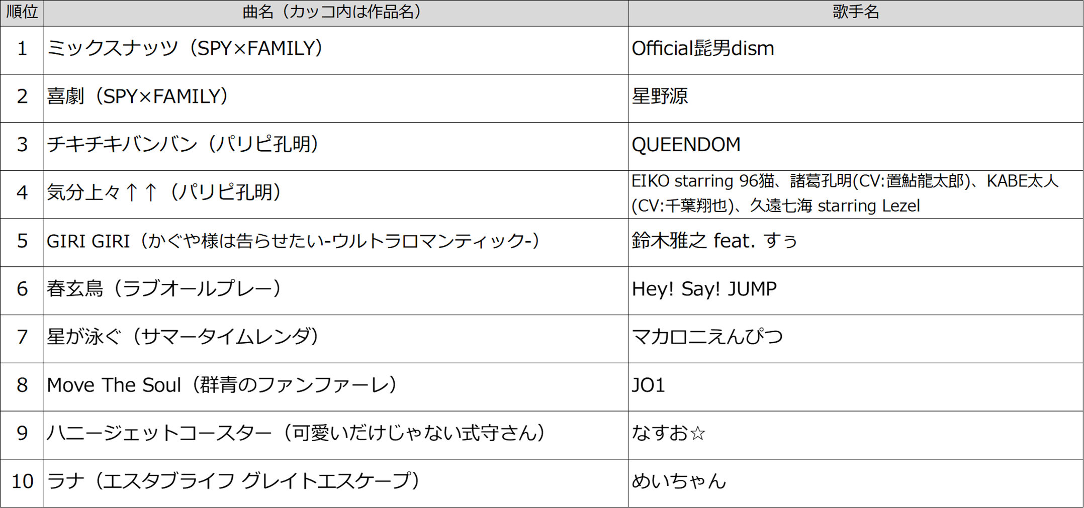 アニメ化発表から大きな期待感が寄せられていた『SPY×FAMILY』に支持が集まることはある程度予想はできていたが、今を時めくofficial髭男dismと星野源の起用という話題性も相まって、トップを独走!しかし、本当に注目すべきは、『パリピ孔明』の大ヒットだろう。OP・EDともにカバーナンバーで攻めてくるとは驚いたが、中でも「チキチキバンバン」は諸葛孔明の出身地である中国でもブレイクするほどの中毒性と、アンセム感に溢れた超優良アニソン。「気分上々↑↑」も懐メロ的な需要も相まって、カラオケの定番ナンバーに返り咲きそうだ。個人的な注目は、9位にランクインした、YouTubeで絶大な人気を誇るシンガー・なすお☆のアニソン・デビュー作となった「ハニージェットコースター」。『可愛いだけじゃない式守さん』と見事に奏功した、ラブリーでキュートなジェットコースター・ポップで存在感をアピールしている。12位の CHiCO with HoneyWorks meets まふまふ「ビビっとラブ」は、『理系が恋に落ちたので証明してみた。r=1-sinθ』OPテーマ だが、明らかに第一期EDテーマでカラオケでもヒットした、ナナヲアカリ「チューリングラブfeat,Sou」の魅力を引き継ぎ、オマージュした楽曲で、こちらも長く歌われる楽曲になりそう。ほかにもオーイシマサヨシ「恋はエクスプロージョン (feat.田村ゆかり)」のように、春アニメ主題歌はデュエットやみんなで盛り上がれるヒットナンバーが多いので、カラオケ需要がますます高まること間違いなし!