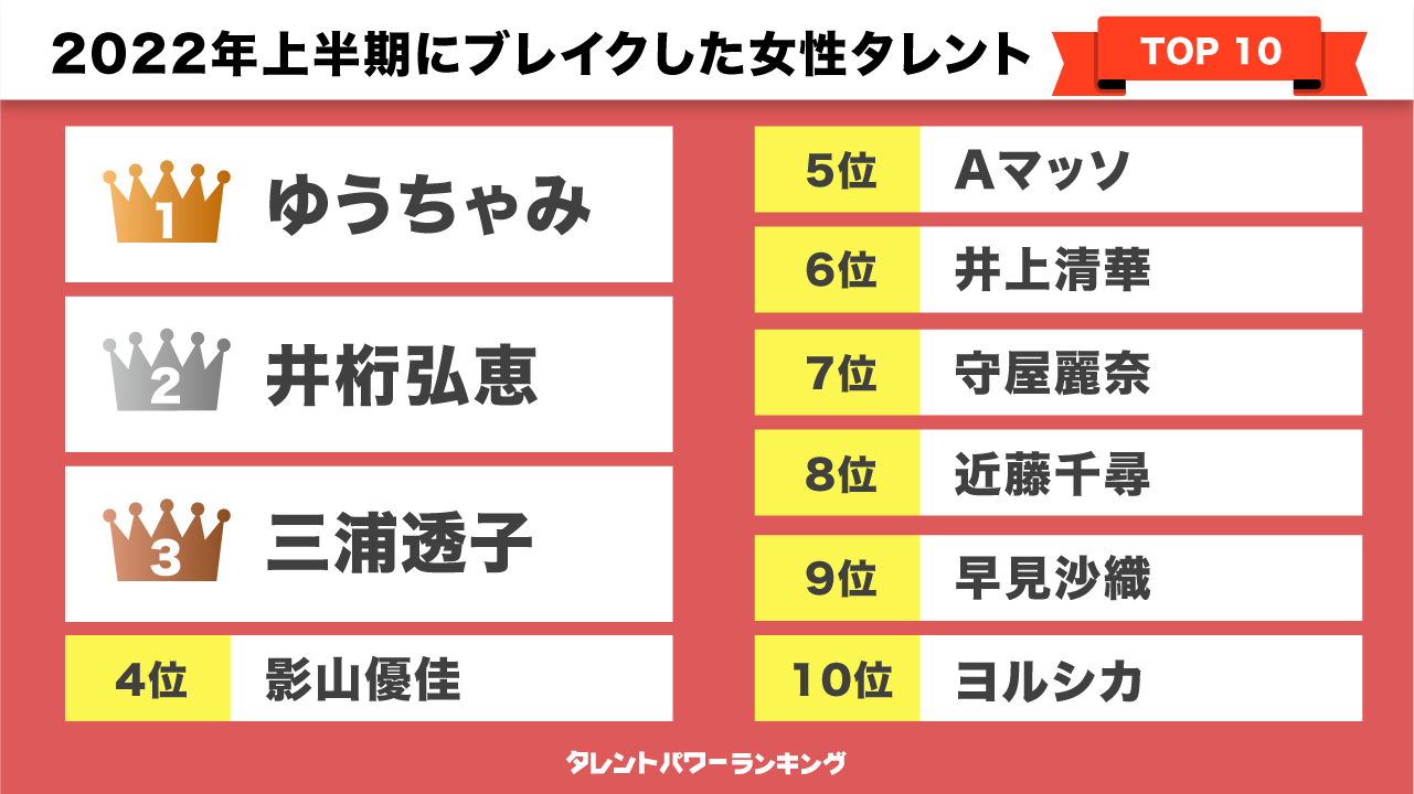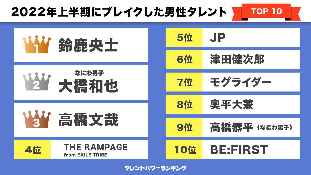 『タレントパワーランキング』では、様々なジャンルで2022年上半期に活躍しブレイクしたタレントについて、男女別でそれぞれランキング形式にまとめました。