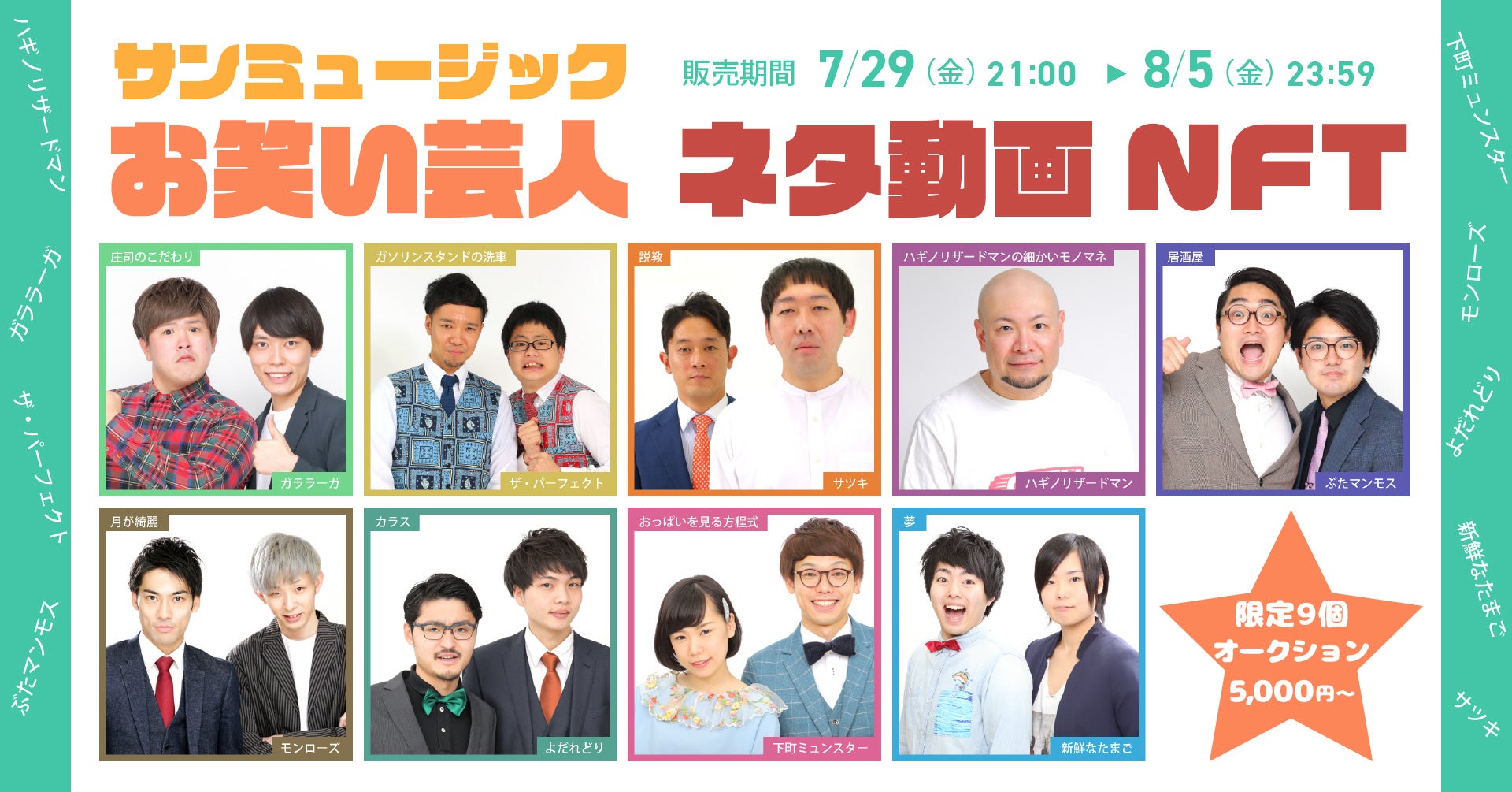 株式会社サンミュージックプロダクションに所属する9組のお笑い芸人がそれぞれ1個のネタ動画を1個のNFTにしてオークション形式で7/29(金)21:00から日本最大級のNFTマーケット&メタバース「HEXA(ヘキサ)」で販売します。