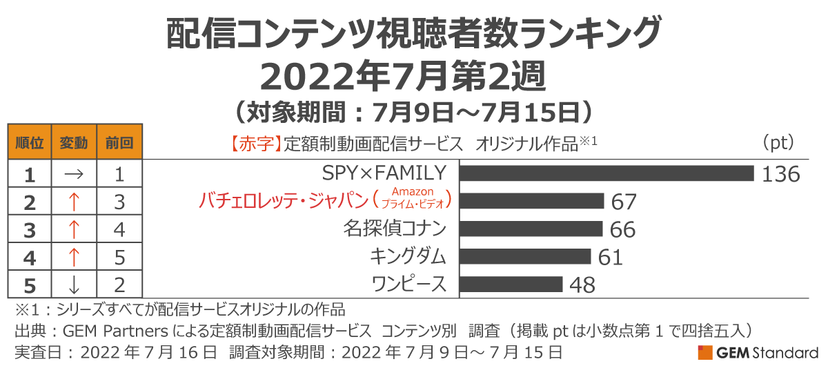 エンタテイメント業界に向けたデータ×デジタルマーケティングサービスを提供するGEM Partners株式会社(ジェムパートナーズ、所在地:東京都港区、代表取締役:梅津文)は7月22日(金)、複数の定額制動画配信サービスを横断して集計した2022年7月第2週の「配信サービス視聴者数ランキング(調査対象期間:7月9日~7月15日、調査対象:日本在住15~69歳男女)」を発表します。