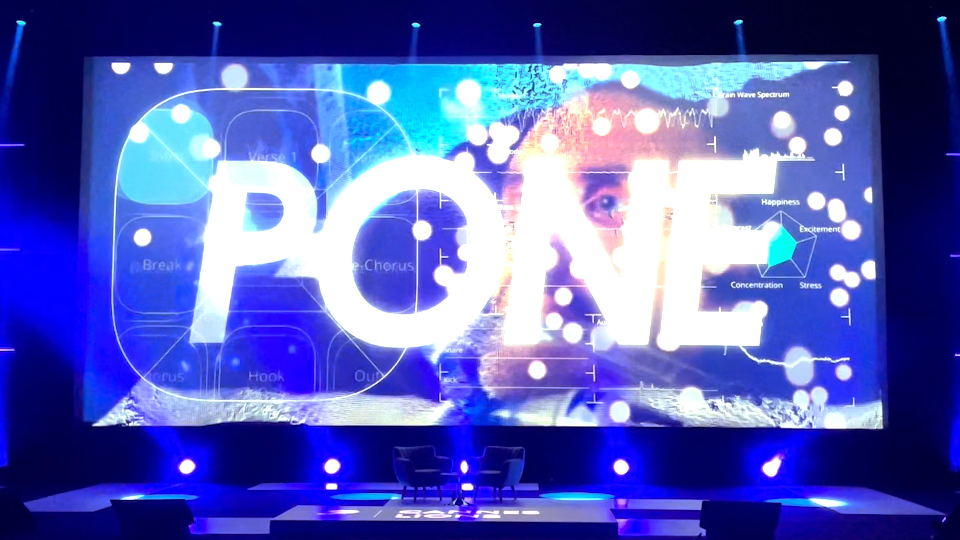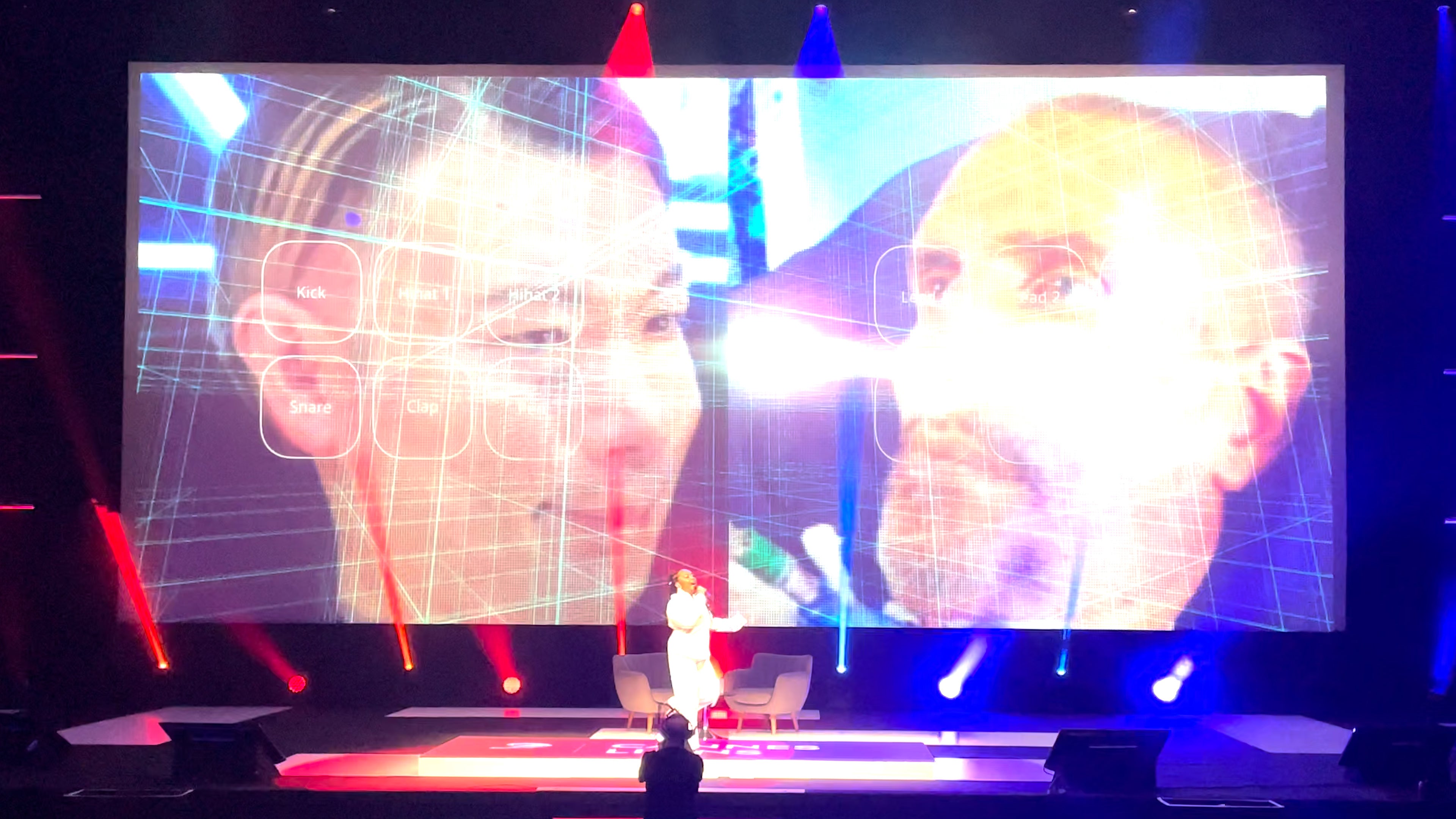 そのものを遅延と同期した動きをつけることで、どのような遅延が起きても、規定の枠に目線を送ることでタイミング良く自由なエフェクトを追加することができる「SHOOTING PAD」により、ダイナミックなパフォーマンスを披露。次々と表示されるエフェクトの枠とPONEさんの目線から生まれる美しい軌道のビジュアルにより、観客をパフォーマンスに引き込み、フィナーレに向け会場の盛り上がりを一層高めました。