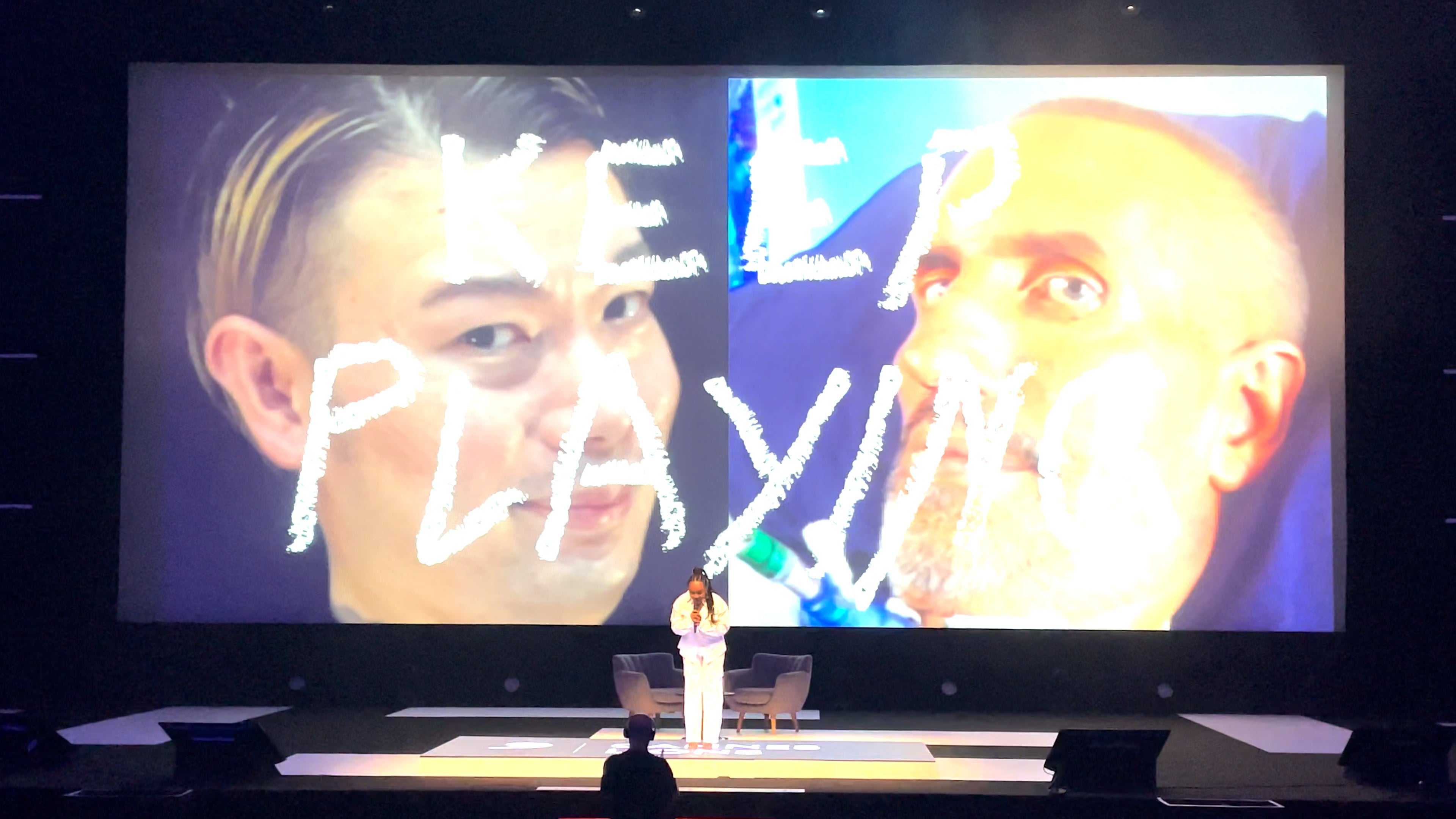 パフォーマンスの終盤では、カンヌ会場に女性シンガーが登場し、武藤さんとPONEさんによる演奏に乗せて、エネルギッシュな歌声を披露。英語と日本語で歌われた「違い、認めあい、支え合い、未来」という歌詞と共に、会場は一体となり大きな盛り上がりを見せました。ラストシーンは、武藤さんとPONEさんが目線で描いた「KEEP PLAYING」という文字が映し出され、すべての人がプレイヤーになれるという力強いメッセージを発信。パフォーマンスが終わると、会場の観客が立ち上がり、拍手と歓声が巻き起こりました。