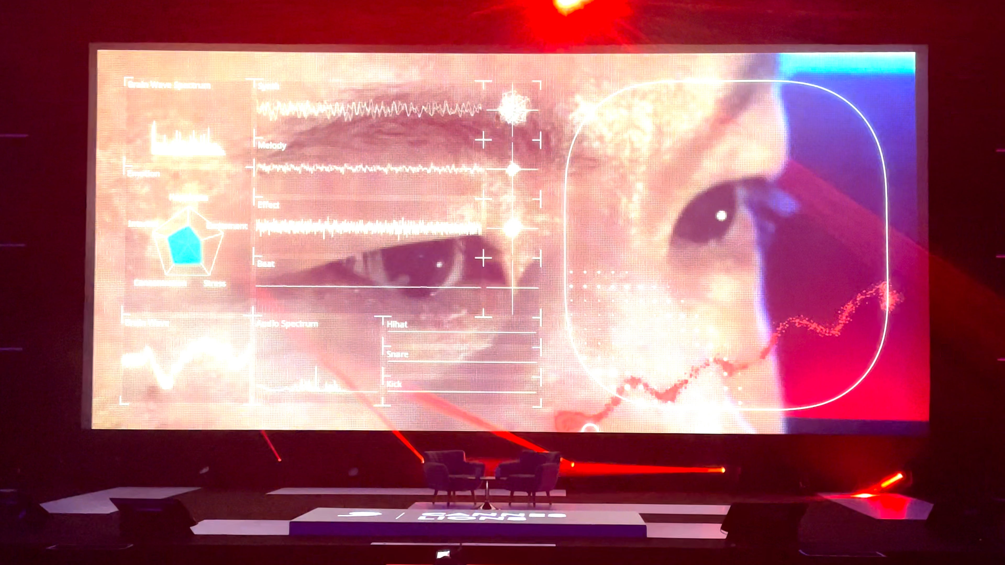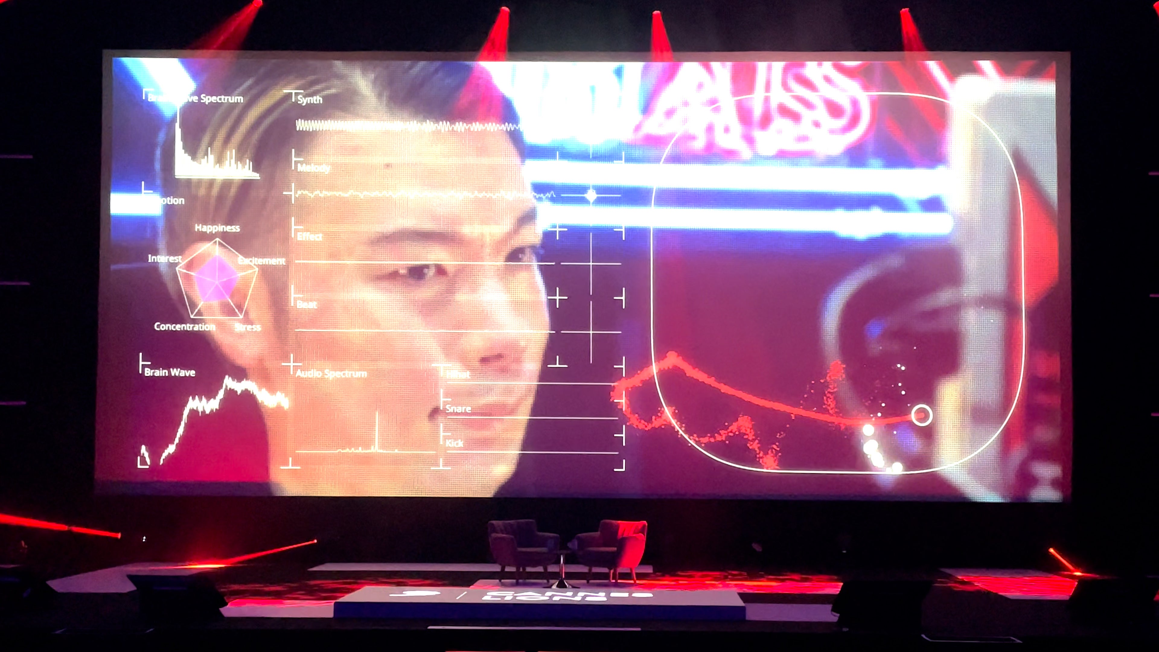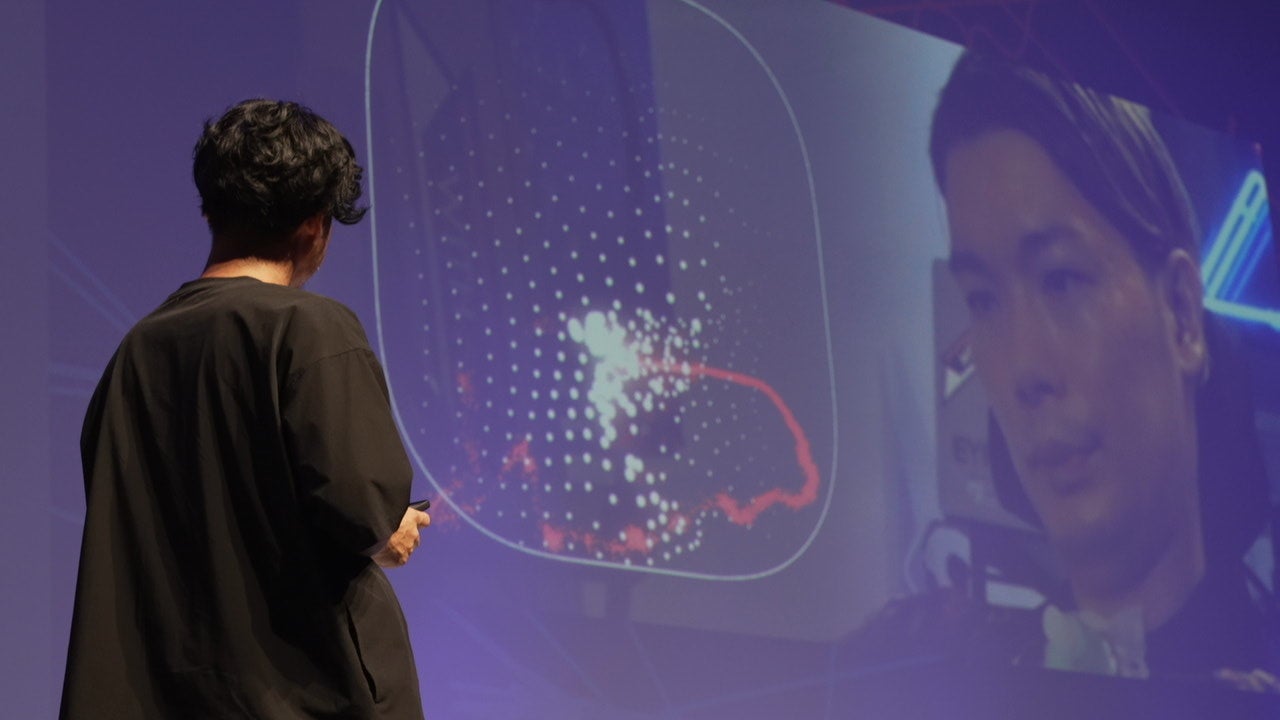 パフォーマンスのトップバッターを務めた武藤将胤さんは、東京会場からリモートで繋ぎ、新開発したUI「EYE XY EYE pad」を使用しながらライブ演奏をしました。「EYE XY PAD」とは、アーティストでもある武藤さんとPONEさんが作曲した音やエフェクトをX軸、Y軸の座標に配置し、目の自由な動きを最大限利用して、これまでにないユニークな演奏をする装置です。会場の画面に映し出された武藤さんの目線が描く軌道と刻々と変化する音楽で、二度と同じ演奏はない、唯一無二のパフォーマンスを行い、会場にいた観客に新たなクリエイティビティの驚きと可能性を与えました。