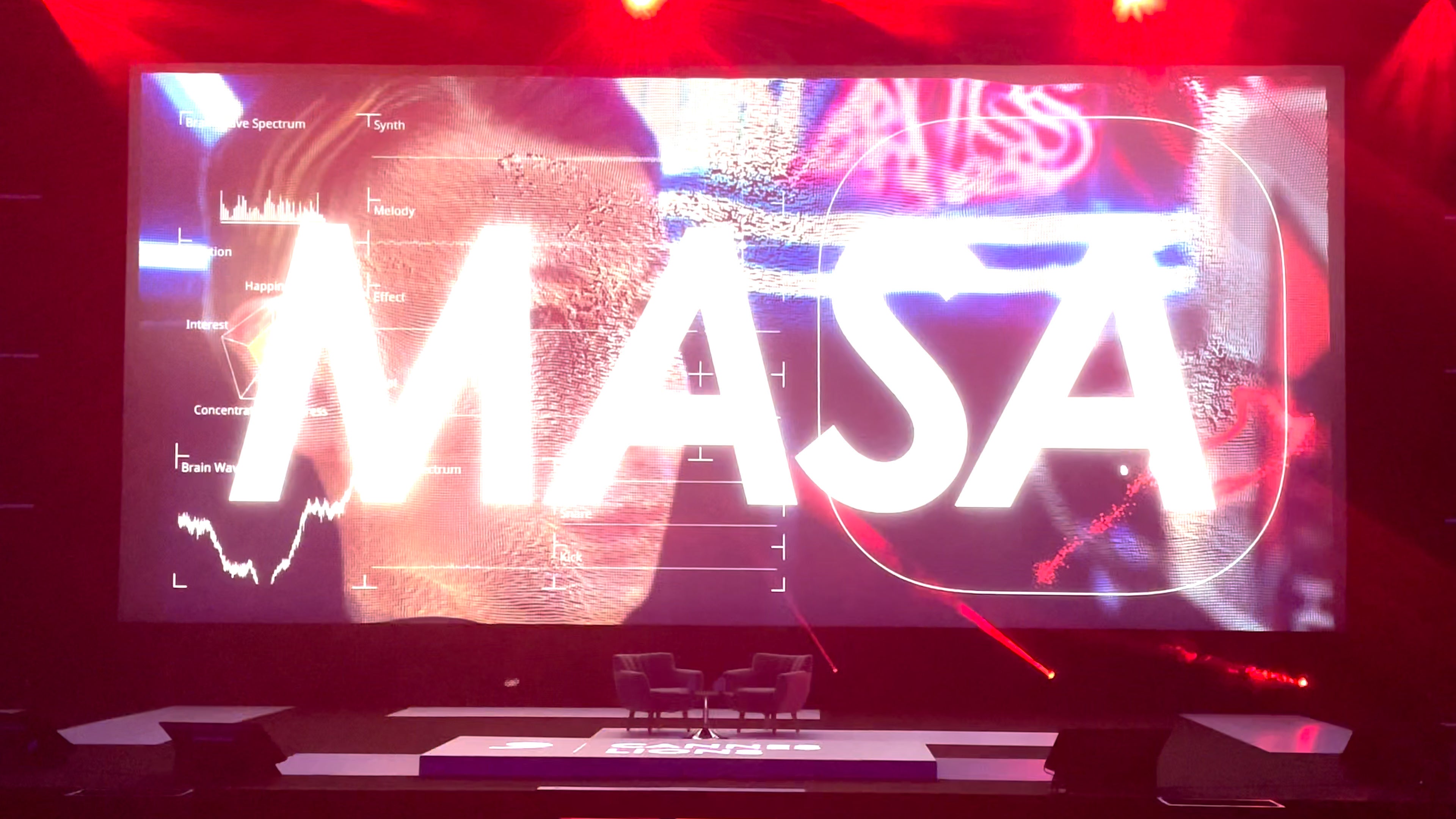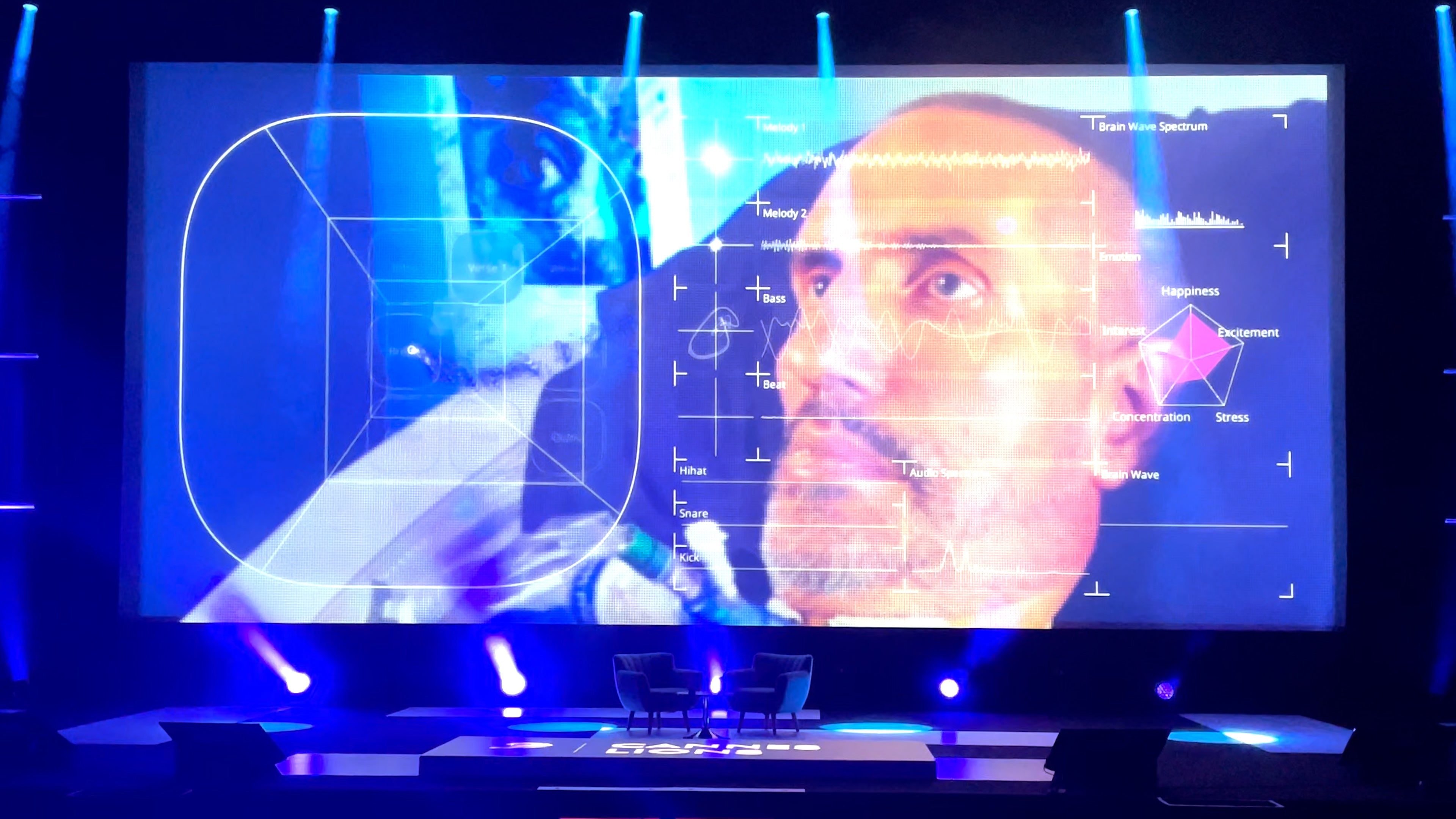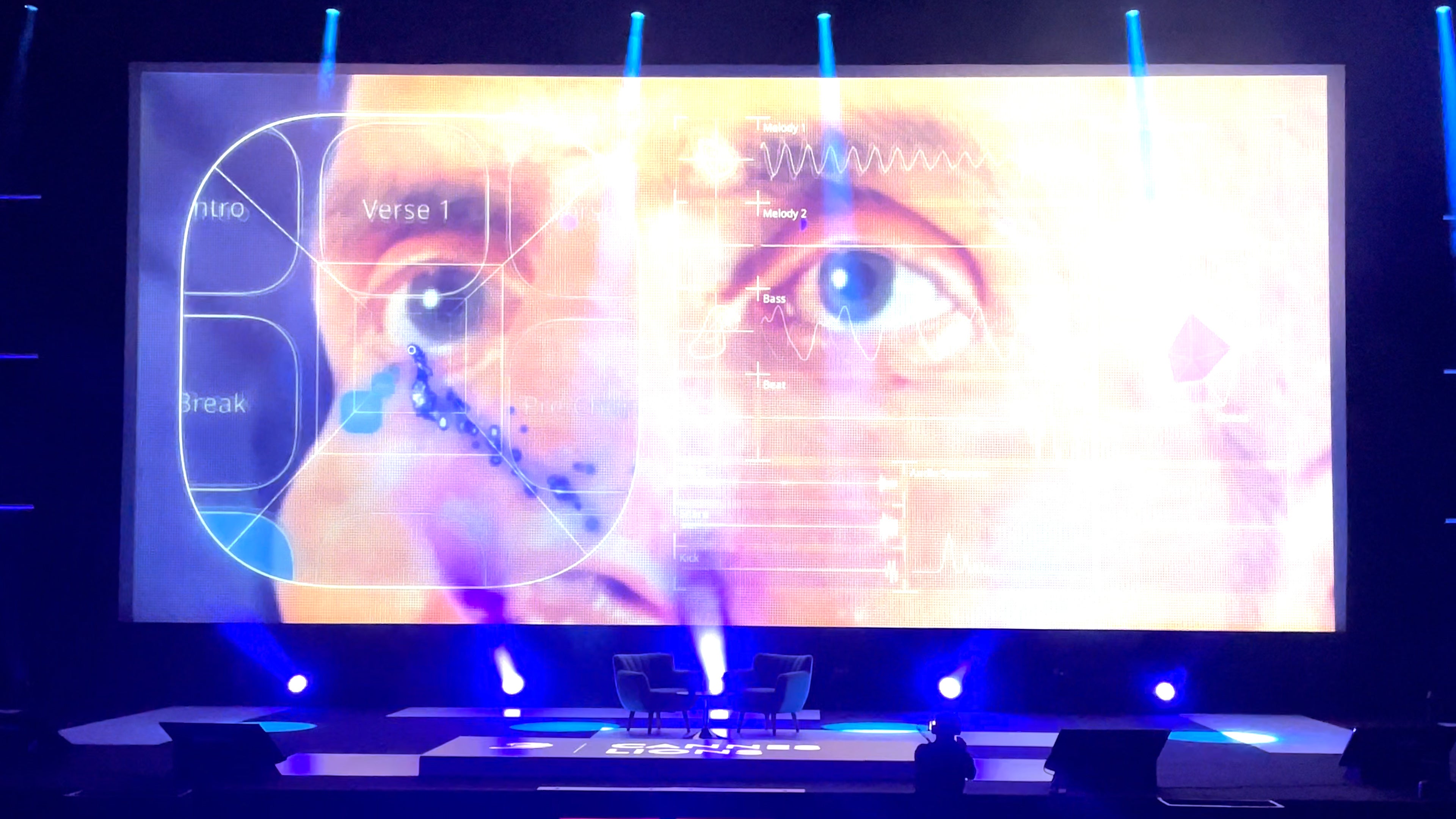 パフォーマンスのトップバッターを務めた武藤将胤さんは、東京会場からリモートで繋ぎ、新開発したUI「EYE XY EYE pad」を使用しながらライブ演奏をしました。「EYE XY PAD」とは、アーティストでもある武藤さんとPONEさんが作曲した音やエフェクトをX軸、Y軸の座標に配置し、目の自由な動きを最大限利用して、これまでにないユニークな演奏をする装置です。会場の画面に映し出された武藤さんの目線が描く軌道と刻々と変化する音楽で、二度と同じ演奏はない、唯一無二のパフォーマンスを行い、会場にいた観客に新たなクリエイティビティの驚きと可能性を与えました。