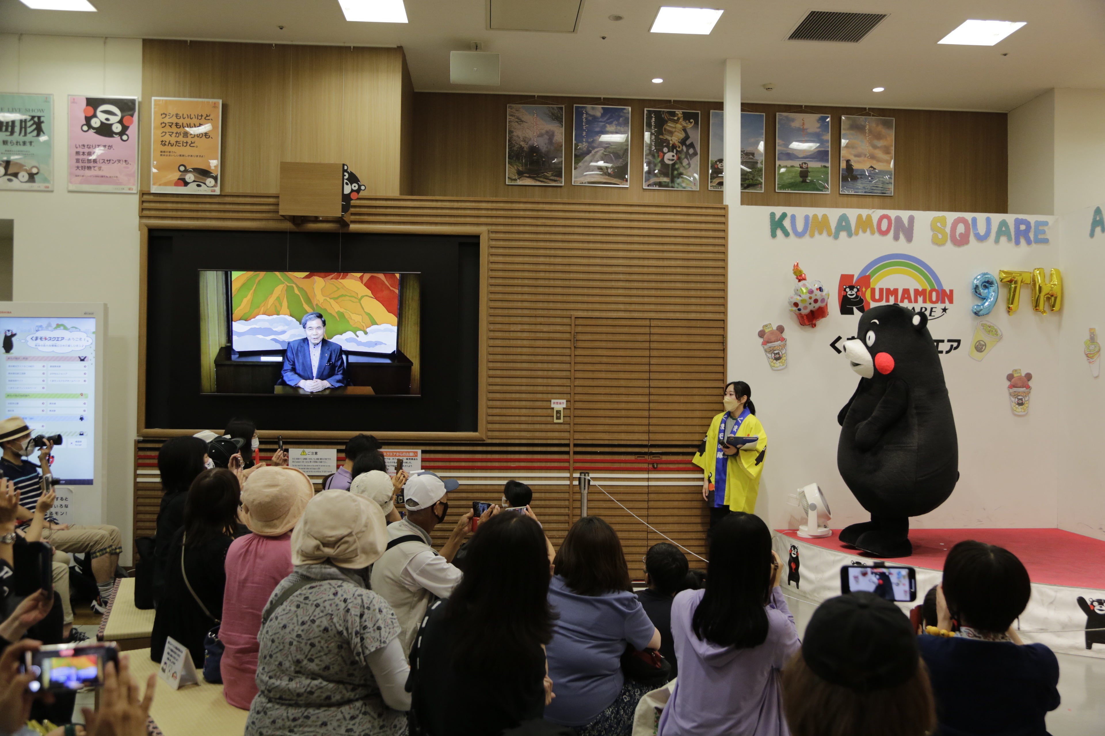 ここでサプライズ。館内のモニターに蒲島熊本県知事のビデオメッセージが映し出される。くまモンへのお祝い、応援してくれ ているファンの皆様への御礼と同時に、 「来年、『くまモンスクエア』がよりくまモンの魅力を感じて頂ける施設とするため、リニューアルを予定しています」