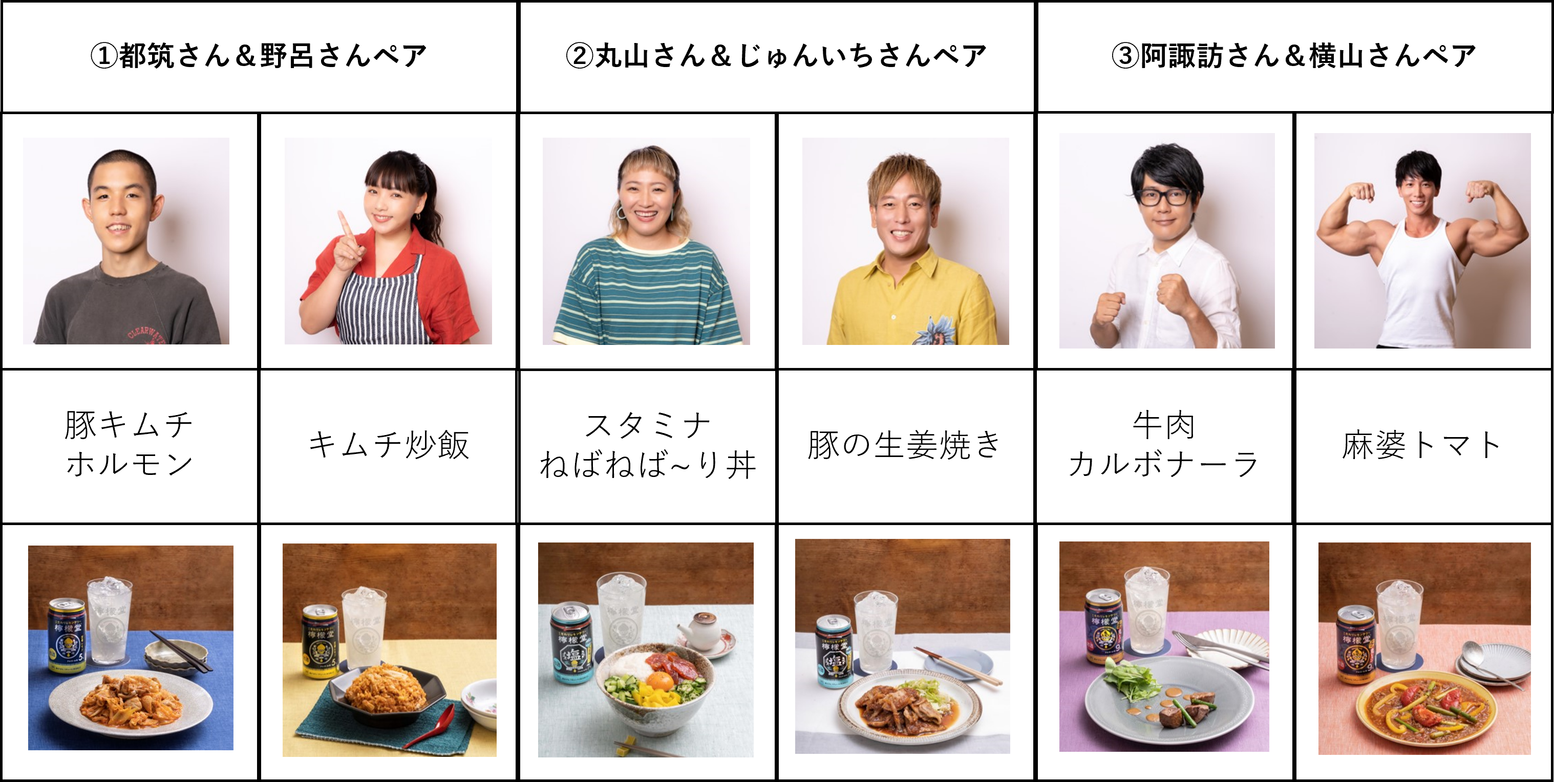 都築さん(四千頭身)&野呂さん、丸山桂里奈さん&じゅんいちさん、阿諏訪さん&ボディビルダー横川さんの3ペアが「檸檬堂」にあう夏のスタミナ料理に挑戦!!MCケンドーコバヤシさんの舌を唸らせたのは?!